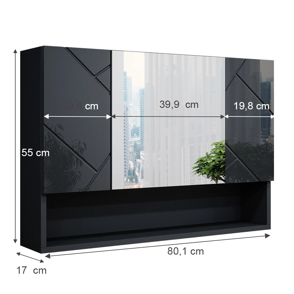 - MAßE: Der Badezimmerschrank mit Spiegel hat eine Breite von 80 cm, eine Höhe von 55 cm und eine Tiefe von 17 cm. Alle detaillierten Größen sind auf den Fotos angegeben.