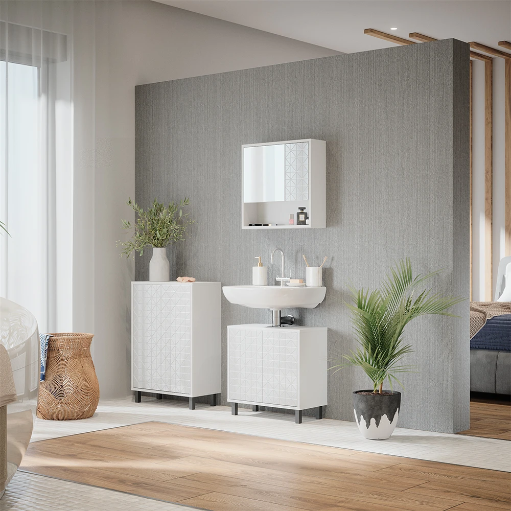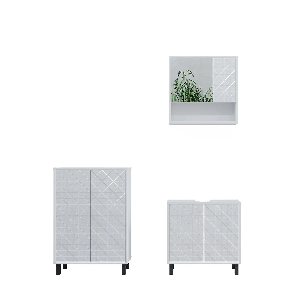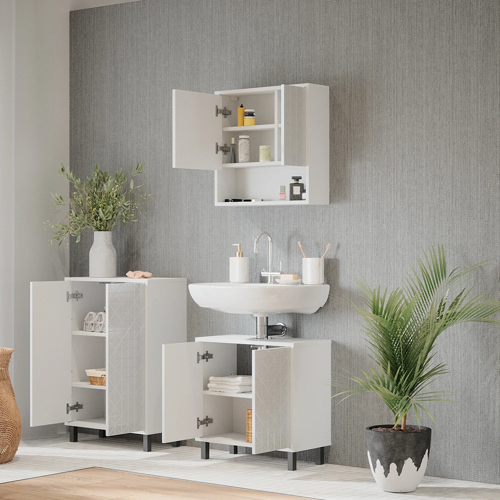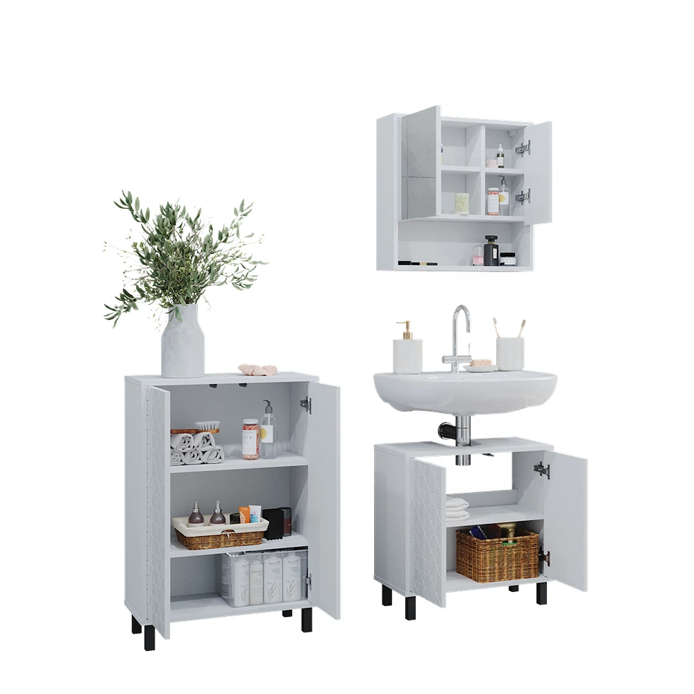 Mit dem Agasta Badmöbel Set bringen Sie Eleganz in Ihr Badezimmer. Das 3-teilige Set besteht aus einem Waschbeckenunterschrank, einem Spiegelschrank und einem Badezimmerschrank, die allesamt bodenstehend mit robusten Metallfüßen ausgestattet sind. Der reichhaltige Stauraum bietet Ihnen ausreichend Platz, um Ihre Kosmetik, Handtücher und andere Badutensilien ordentlich zu verstauen. Besonders praktisch: Sie können verschiedene Sets der Agasta-Serie miteinander kombinieren und das Set durch weitere Artikel der Kollektion ergänzen. So wird aus Ihrem Badezimmer eine wahre Wohlfühloase mit Stil. Gönnen Sie sich das Agasta Badmöbel Set und freuen Sie sich auf ein stilvolles und aufgeräumtes Badezimmer!