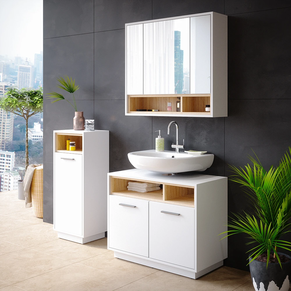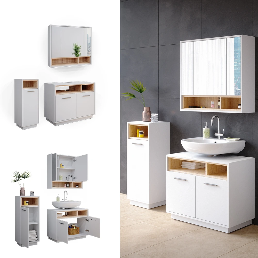 - MATERIAL: Das Set mit dem Spiegelschrank besteht aus pflegeleichter Spanplatte 16 mm, mit einer Melaminharzbeschichtung.