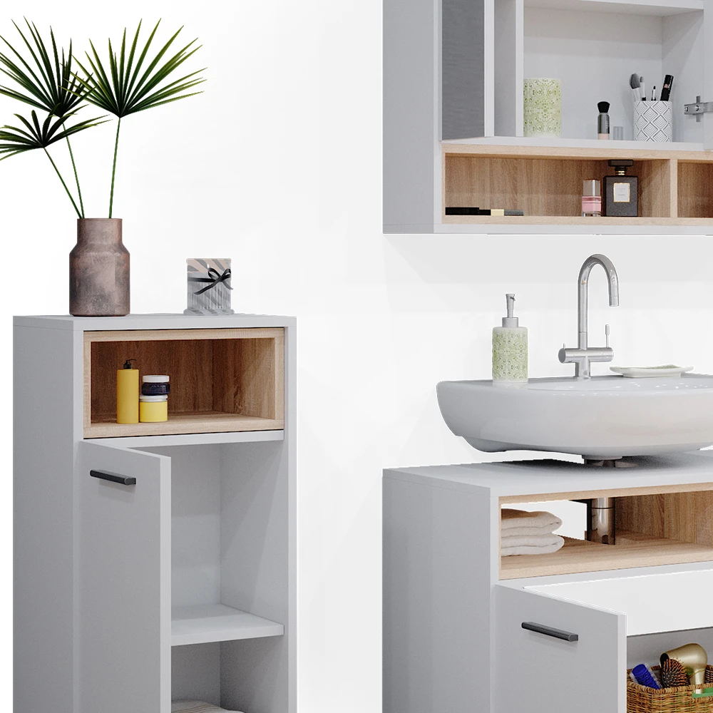 - Das Badezimmerschrank-Set bietet eleganten Stauraum und lässt sich mit anderen Sets der Serie kombinieren. Es ist die perfekte Wahl für jeden Badezimmerstil.