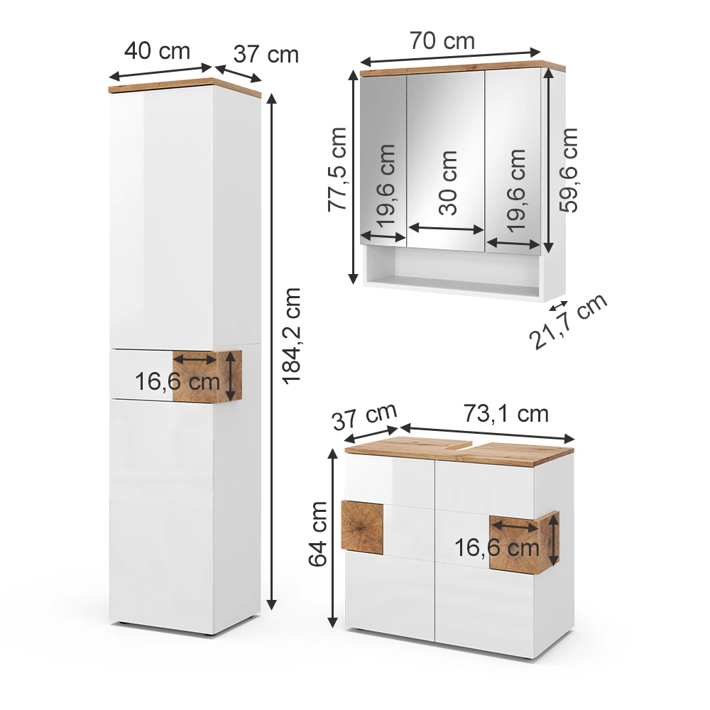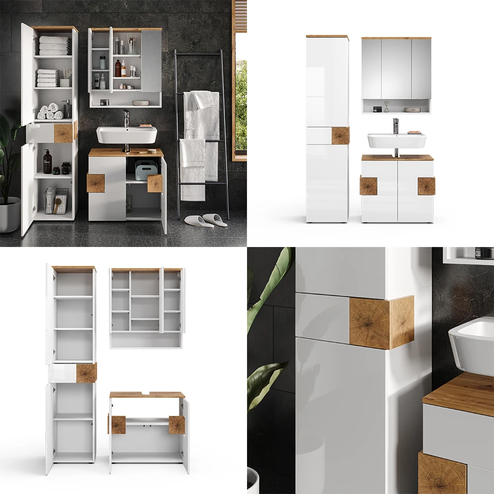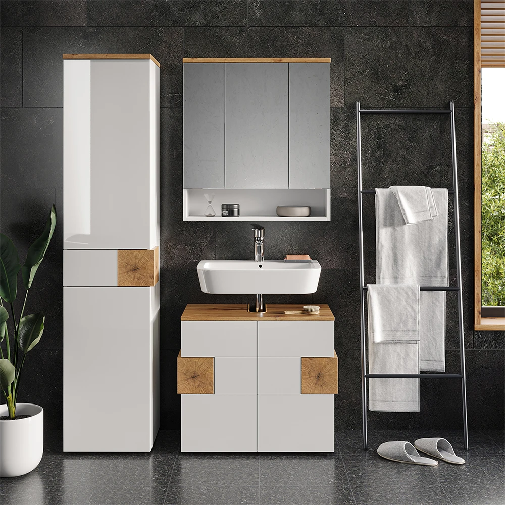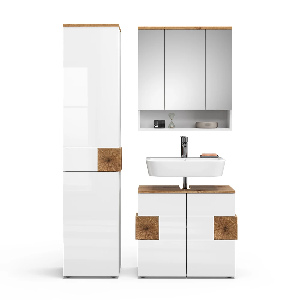 - Dieses elegante Badmöbelset besteht aus einem 3-türigen Spiegelschrank, einem Hochschrank und einem Waschtischunterschrank mit Siphonausschnitt.