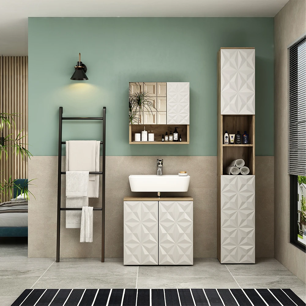 - MATERIAL: Das Set mit dem Spiegelschrank besteht aus pflegeleichter Spanplatte 16 mm, mit einer Melaminharzbeschichtung.