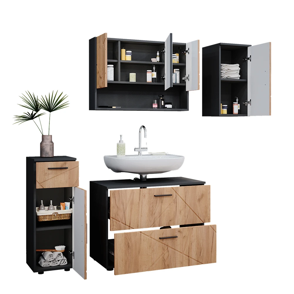 - LIEFERUMFANG: Waschbeckenunterschrank, Bad Spiegelschrank, 1x Midischrank, 1x Hängeschrank, Montageanleitung, Montagematerial