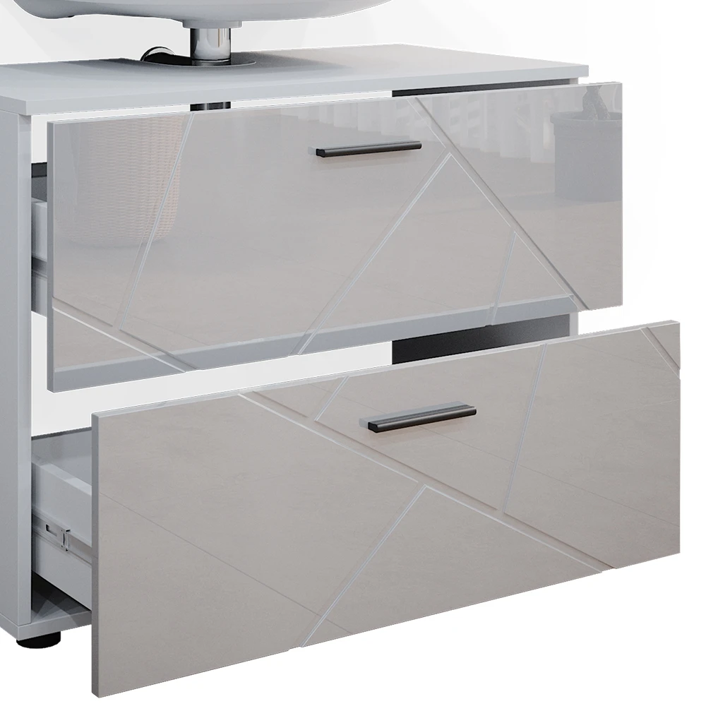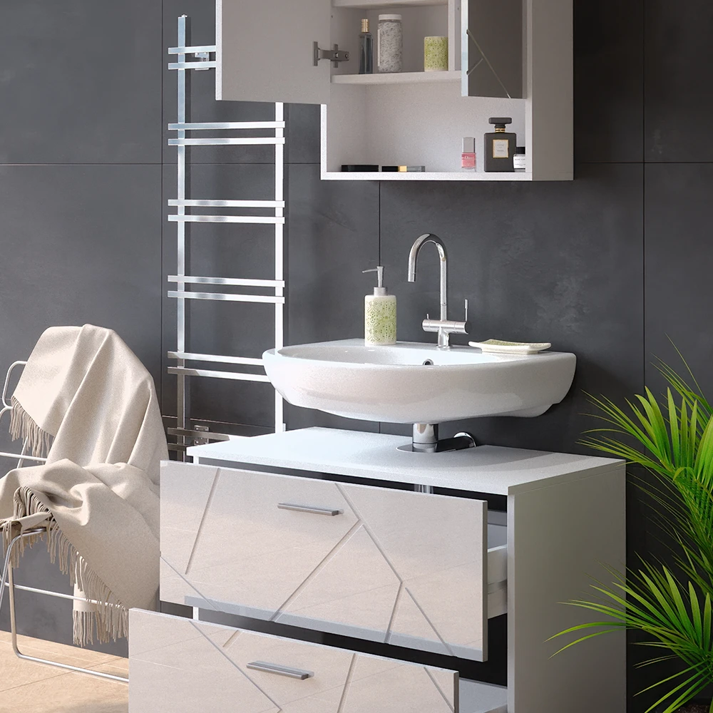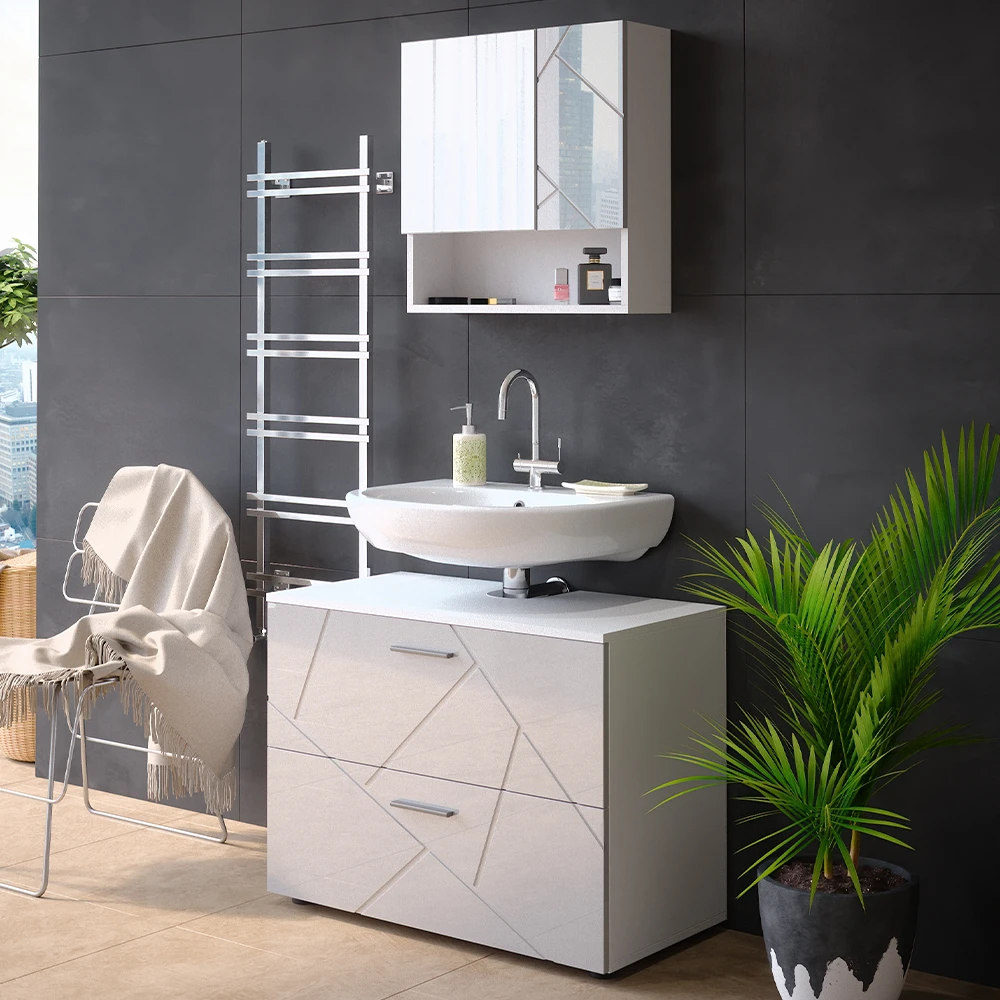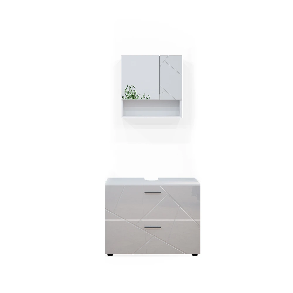 Das Badmöbel Set Irma ist ein Meisterwerk in Sachen modernes Design und Funktionalität. Das Set besteht aus einem Waschbeckenunterschrank und einem Spiegelschrank, die perfekt aufeinander abgestimmt sind. Durch die Möglichkeit, verschiedene Sets der Serie zu kombinieren, können Sie Ihr Badezimmer ganz individuell gestalten. Die durchdachte Konstruktion mit Füßen an allen Einrichtungsgegenständen bietet nicht nur eine ansprechende Optik, sondern auch reichlich Stauraum für Ihre Badutensilien. Eine wahre Besonderheit des Sets ist, dass es mit zusätzlichen Artikeln aus der Kollektion Irma ergänzt werden kann. Erleben Sie das Gefühl von Luxus und moderner Eleganz in Ihrem Badezimmer mit dem Badmöbel Set Irma!