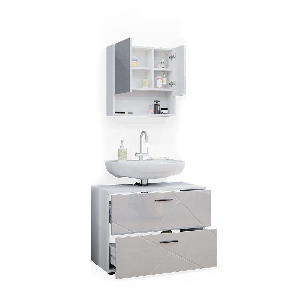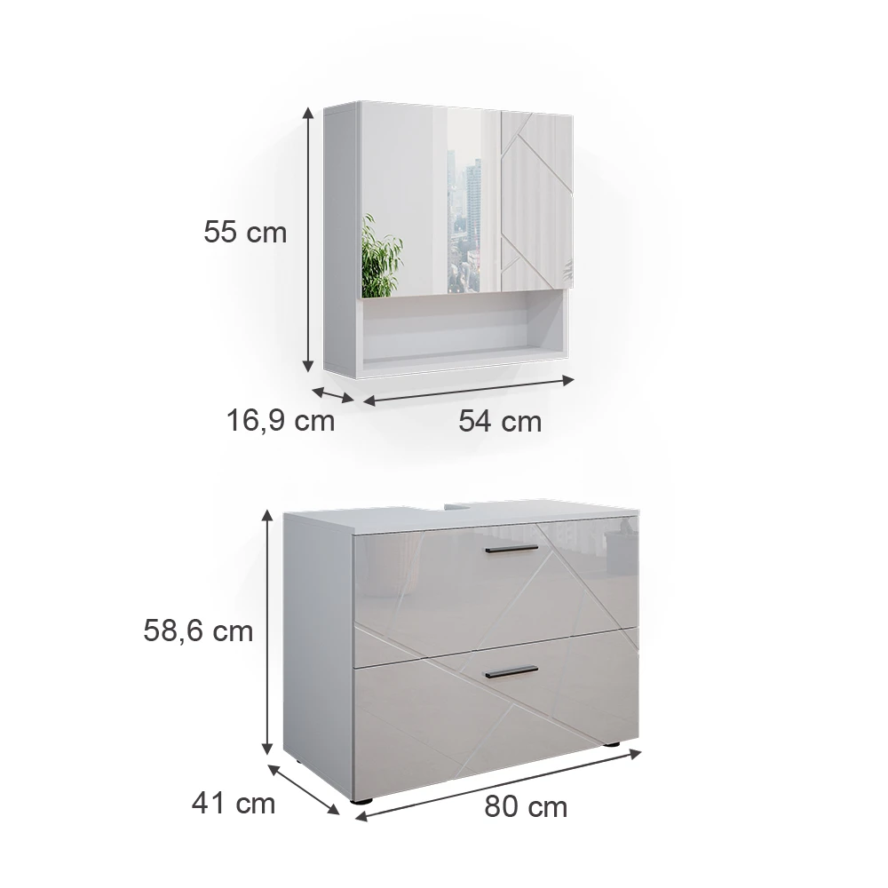 - MATERIAL: Das Set mit dem Spiegelschrank besteht aus pflegeleichter Spanplatte 16 mm, mit einer Melaminharzbeschichtung. Einige Bestandteile des Artikels sind aus MDF gefertigt.