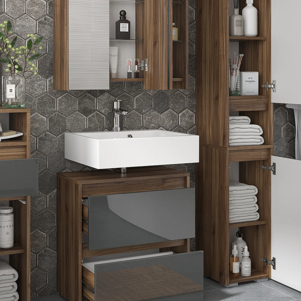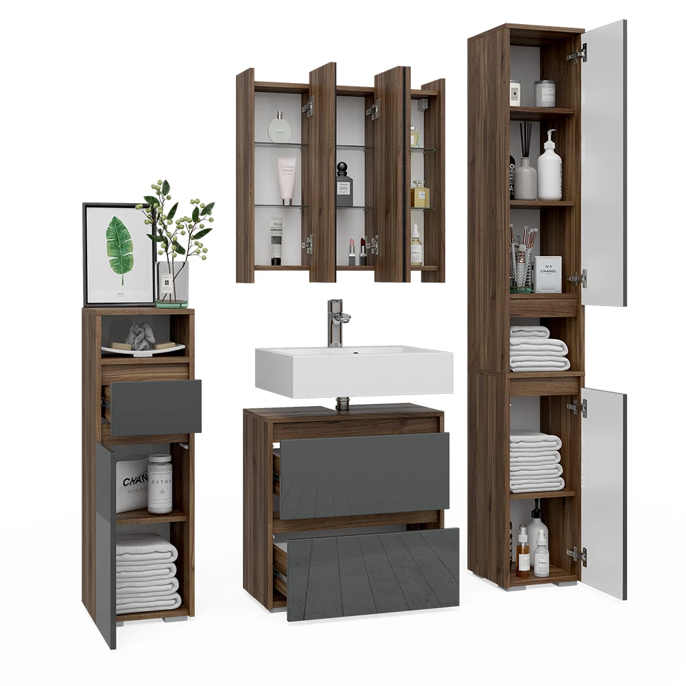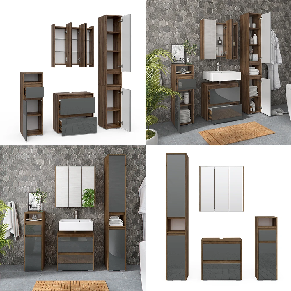 Erleben Sie das Majest Badmöbel Set – ein Meisterwerk moderner Eleganz für Ihr Badezimmer. Das 4-teilige Set besteht aus einem Waschbeckenunterschrank, einem Spiegelschrank und weiteren Schränken, die reichlich Stauraum für all Ihre Badutensilien bieten. Der moderner Stil des Sets fügt sich perfekt in jede Badezimmereinrichtung ein und lässt sich problemlos mit anderen Sets der Majest-Serie kombinieren. Das Set kann auch mit zusätzlichen Artikeln der Majest-Kollektion ergänzt werden, um Ihrem Badezimmer einen noch größeren Hauch von Luxus zu verleihen. Entdecken Sie Majest und genießen Sie ein unvergessliches Bad-Erlebnis.