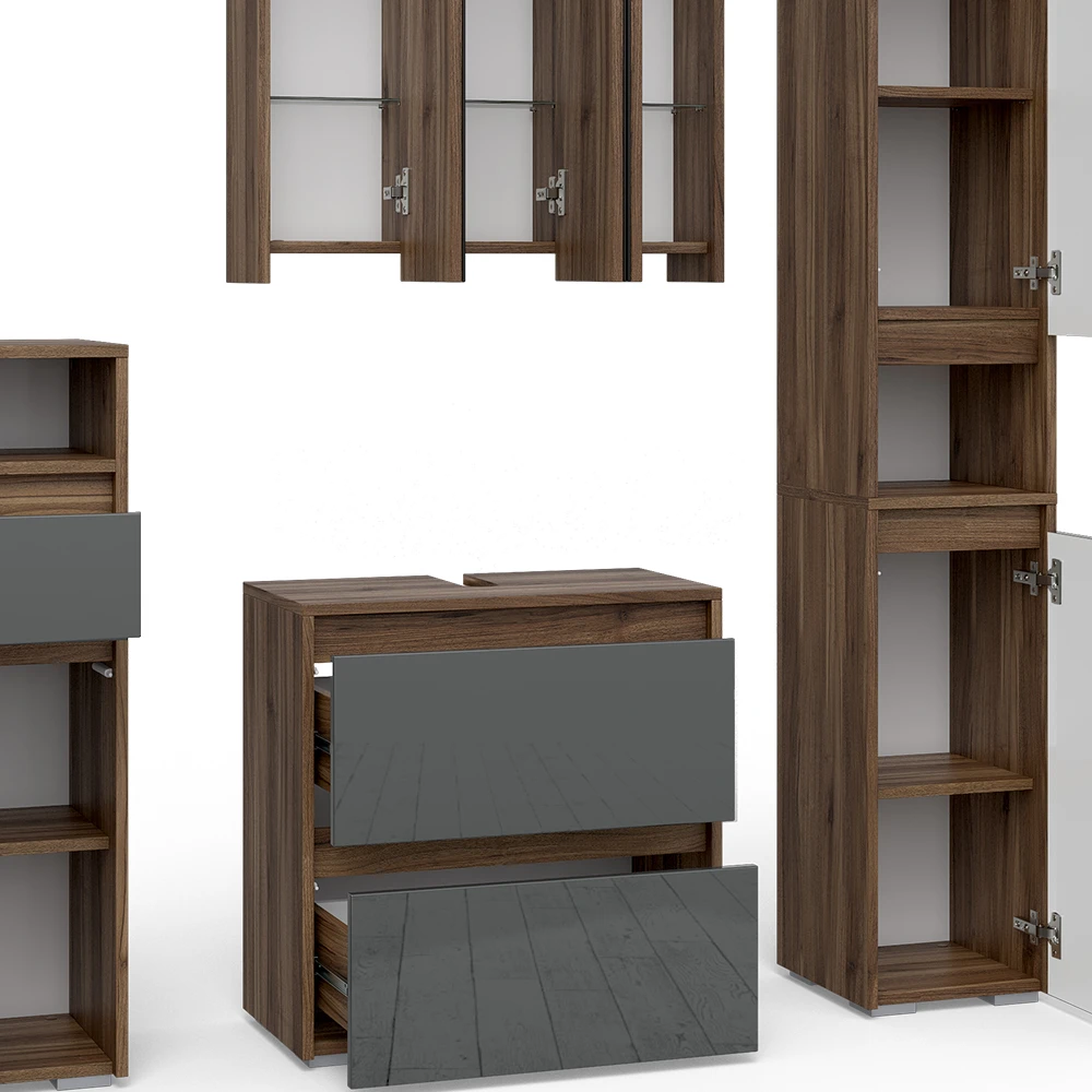 - Das Badezimmerschrank-Set bietet reichlich Stauraum mit offenen und geschlossenen Ablagefächern. Verschiedene Sets der Serie lassen sich kombinieren.