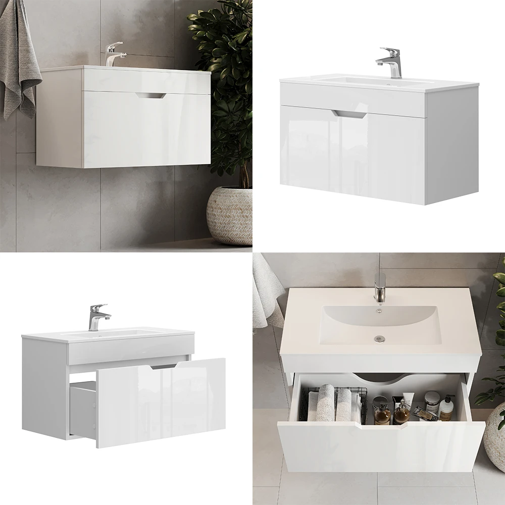 Die Schublade des Waschtischunterschranks ist mit einem hochwertigen „Häfele“-Soft-Close-Scharnier, für sanftes Öffnen und Schließen, ausgestattet. Die edle Hochglanzfront verleiht dem Badschrank eine elegante und moderne Optik. Das Waschbecken ist bereits im Lieferumfang enthalten, sodass Sie alles für Ihren Waschplatz komplett haben. Die pflegeleichte Oberfläche ermöglicht eine einfache Reinigung und langanhaltende Schönheit.