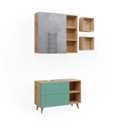 Genießen Sie eine harmonische Einrichtung. Das Badmöbel-Set ist Teil der Rudi-Serie und bietet eine durchgängige Ästhetik in Ihrem Badezimmer. Erleben Sie Komfort pur. Die Möbel verfügen über eine praktische „Push-to-Open“ – Funktion, die ein müheloses Öffnen ermöglicht. Tauchen Sie in zeitgemäße Eleganz ein. Das Set besticht mit einem modernen Design, das Ihrem Badezimmer einen stilvollen Touch verleiht. Genießen Sie eine unkomplizierte Reinigung. Die pflegeleichte Oberfläche der Möbel sorgt dafür, dass Sie Ihre Badmöbel mühelos sauber halten können.
