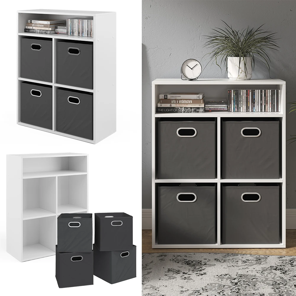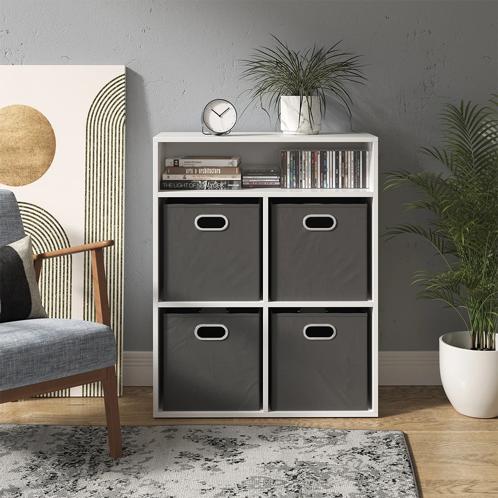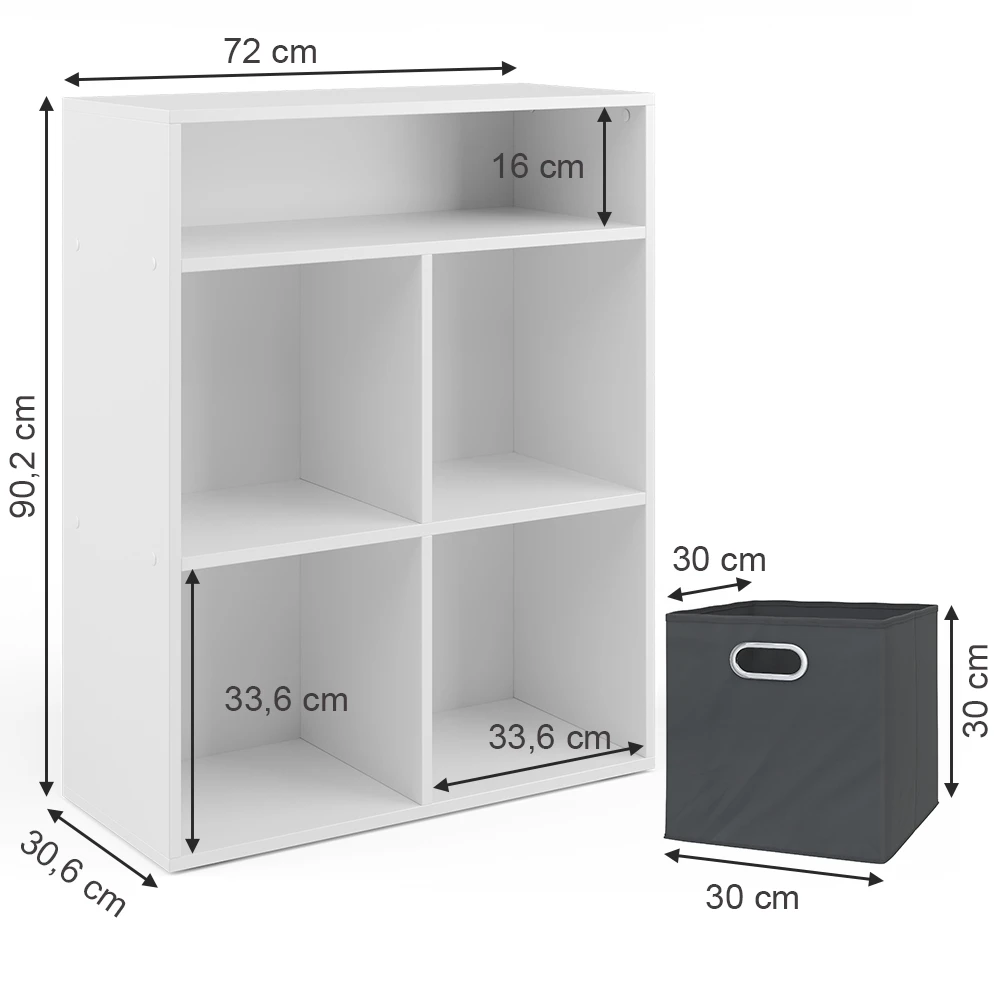 - LIEFERUMFANG: Bücherregal, 4x Faltbox, Montageanleitung, Montagematerial