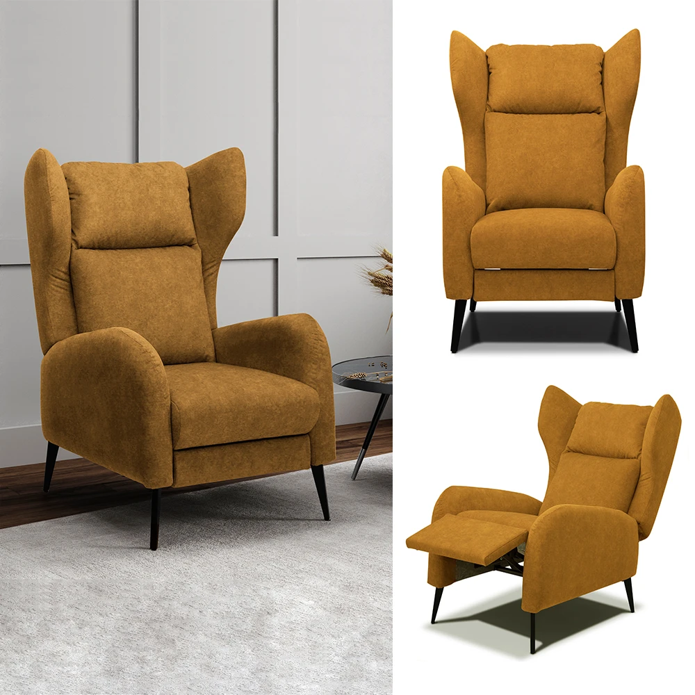 - MATERIAL: Der Relaxsessel besticht durch ein stabiles Gestell aus Holz und stilvolle Metallfüße. Das Schaumstoff-Polster ist mit einem gelben, pflegeleichten Polyesterbezug versehen.