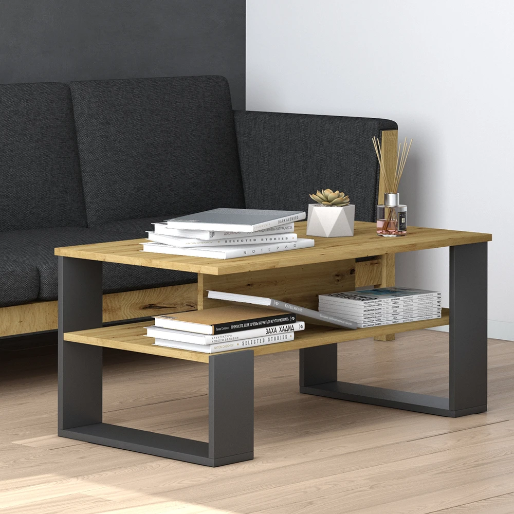 - Der Couchtisch mit Ablage bietet viel Stauraum dank des offenen Regals mit Trennwand und hat asymmetrische Füße für einen modernen Look.
