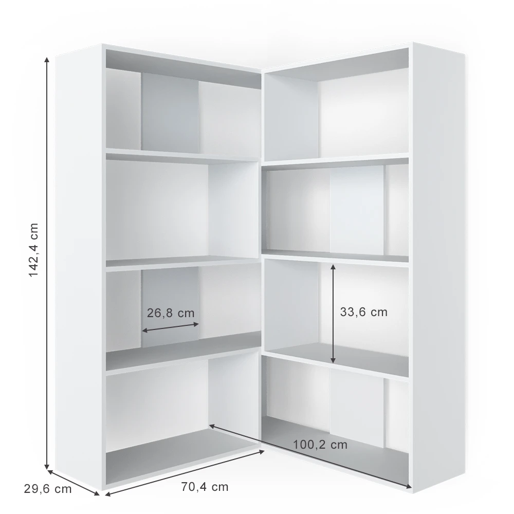 Mit dem Eckregal Laine schaffen Sie mehr Platz und Ordnung in Ihrer Wohnung! Das funktionelle Design fügt sich perfekt in jede Ecke ein und bietet Ihnen fünf offene Einlegeböden für Bücher, Dekoration und alles, was Sie gerne zur Schau stellen möchten. Das Eckregal eignet sich als Bücherregal oder als Standregal und macht in jedem Raum eine gute Figur. Besonders praktisch ist das Platzsparen, da die Ecke so oft ungenutzt bleibt. Das Modell Laine lässt sich zudem hervorragend mit anderen Möbelstücken kombinieren und bildet somit eine harmonische Einheit in Ihrem Zuhause. Verwandeln Sie Ihre Ecke in etwas Besonderes mit dem Eckregal Laine!