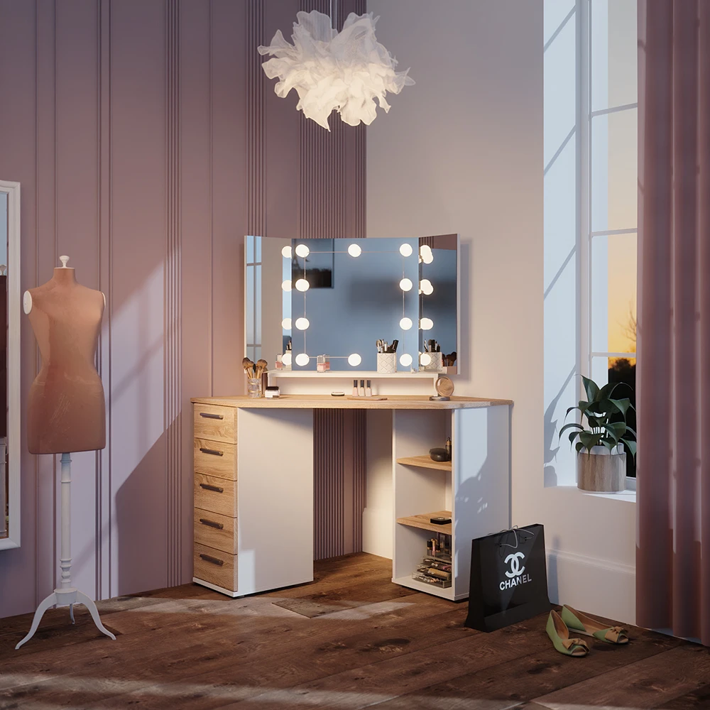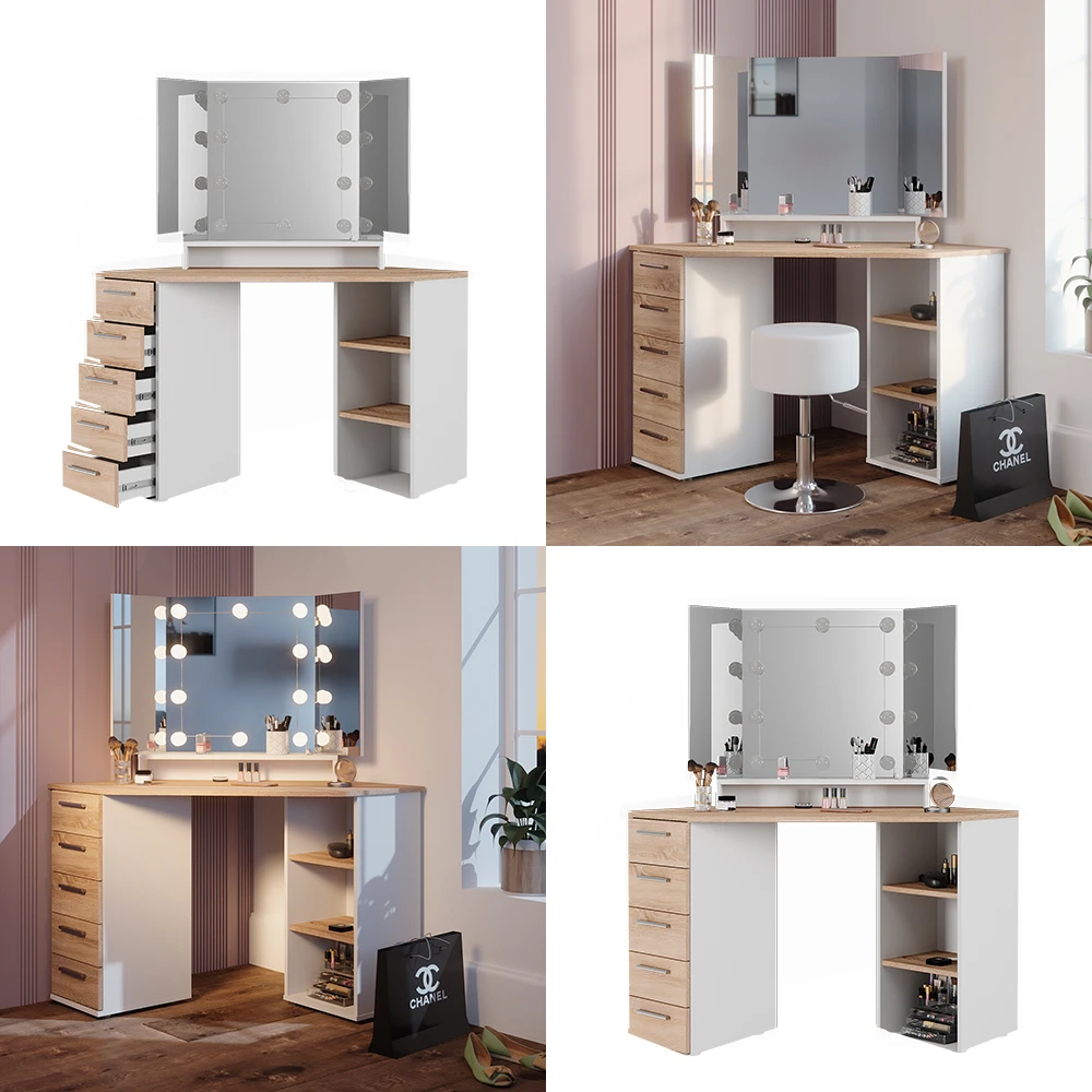 - MAßE: Der Eckschminktisch hat eine Breite von 128,4 cm, eine Höhe von 142,3 cm und eine Tiefe von 50,8 cm. Alle detaillierten Größen sind auf den Fotos angegeben.
