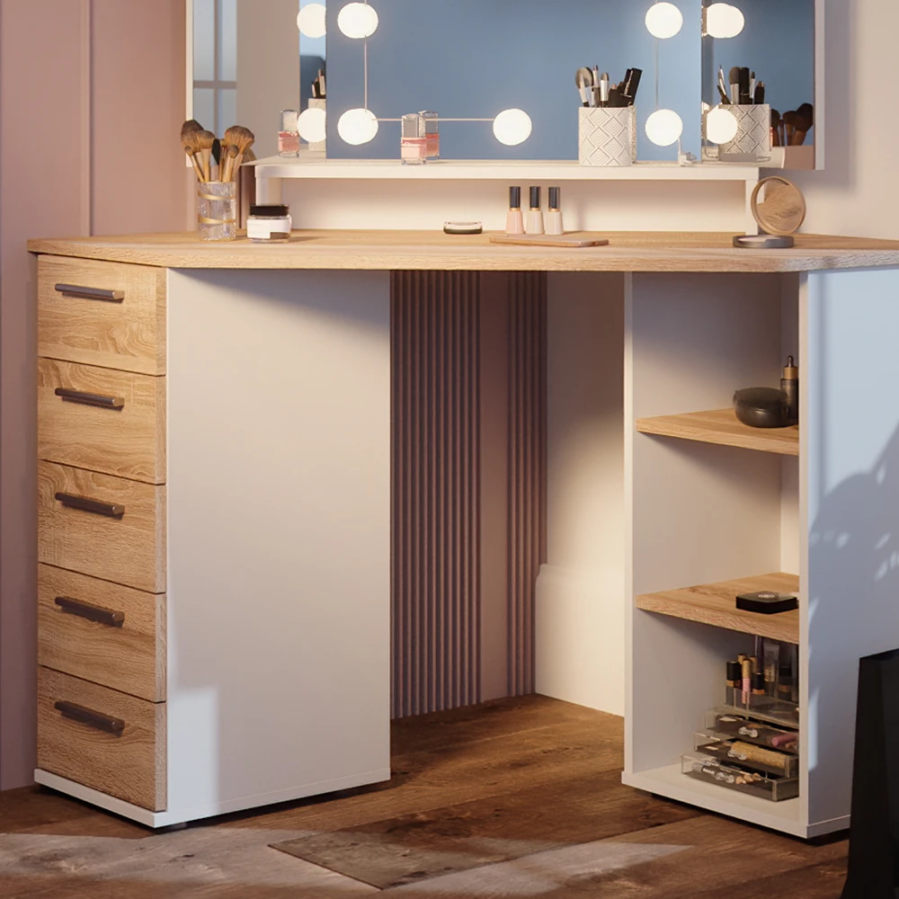 Die Sofia-Frisierkommode für die Ecke ist der perfekte Platz für Ihr tägliches Schönheitsritual. Mit ihrem funktionalen Design und einer Vielzahl an Aufbewahrungsmöglichkeiten, darunter drei offene Einlegeböden und fünf geschlossene Fächer, bietet dieser Schminktisch alles, was Sie brauchen, um Ihre Kosmetika und Accessoires ordentlich zu organisieren. Der große Dreifachspiegel ermöglicht Ihnen eine perfekte Sicht auf Ihr Aussehen, während Sie sich schminken oder frisieren. Aber das Beste ist, dass Sie das Schminktischmodell in verschiedenen Ausführungen erhalten können und somit sicherstellen, dass es perfekt in Ihre Einrichtung passt. Machen Sie sich bereit, um sich in Ihrem neuen Schminktisch zu verlieben – es ist der perfekte Ort, um sich wie eine Königin zu fühlen, wenn Sie sich jeden Morgen fertig machen.