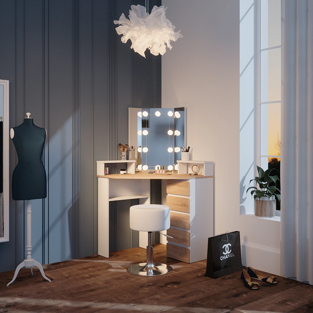 Eckschminktisch „Tilda“ Weiß/Sonoma/Sonoma 113.3 Cm Mit LED Beleuchtung Und Hocker Vicco