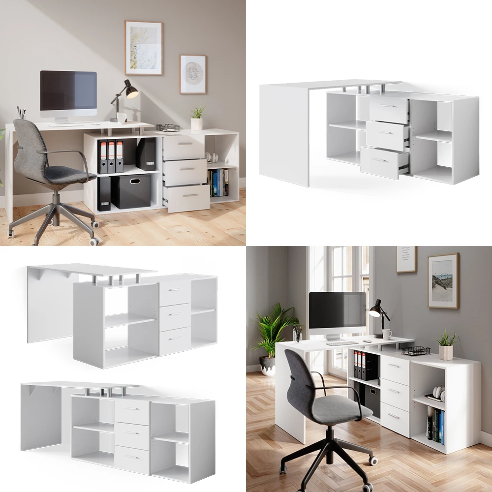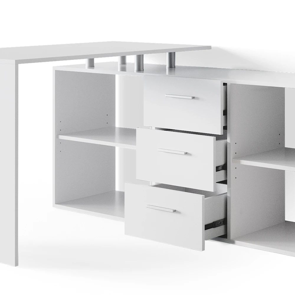 - Der Winkelschreibtisch kann sowohl schräg als auch aufrecht aufgestellt werden und verfügt über drei Schubladen sowie offene Regale.
