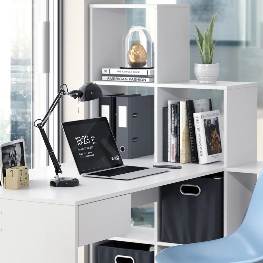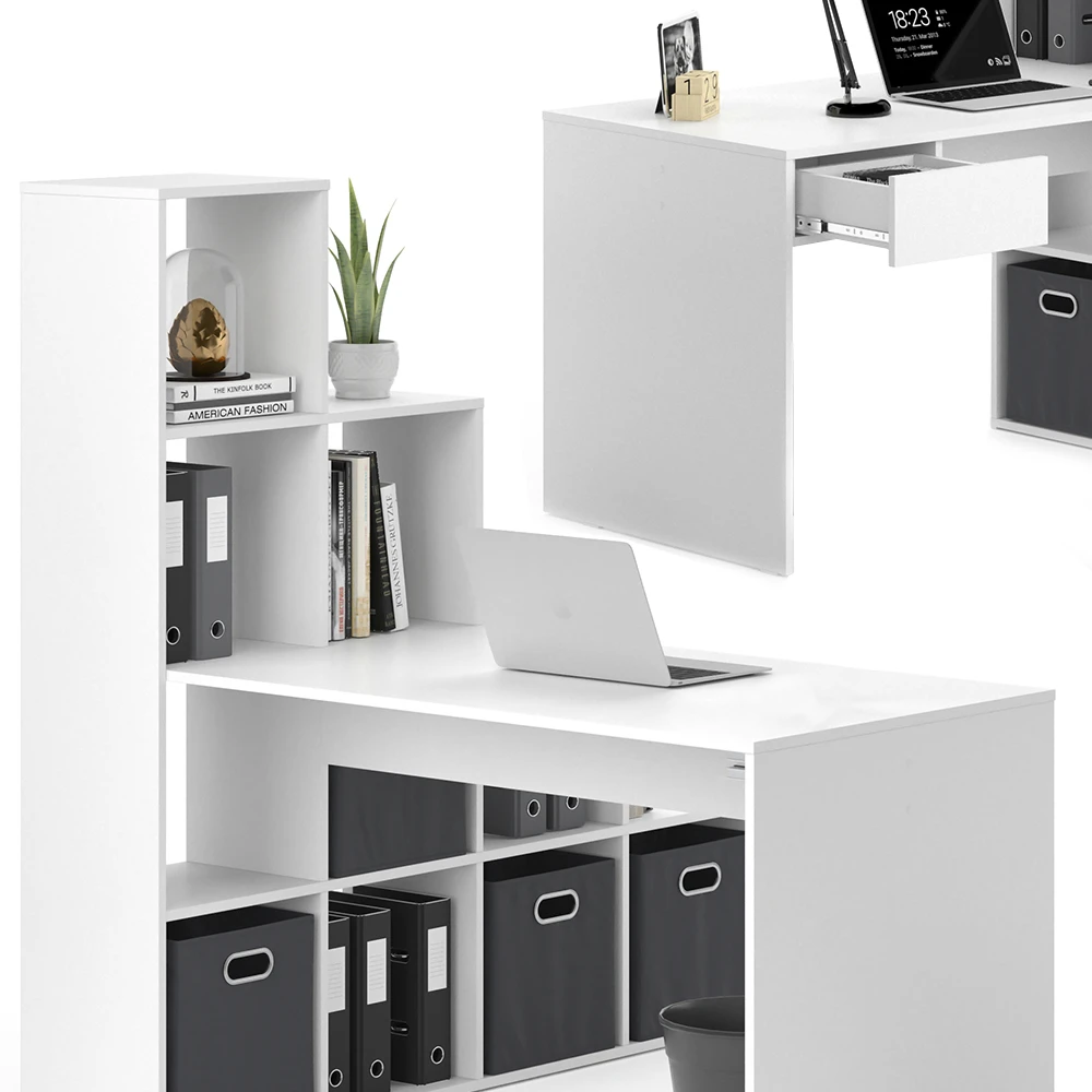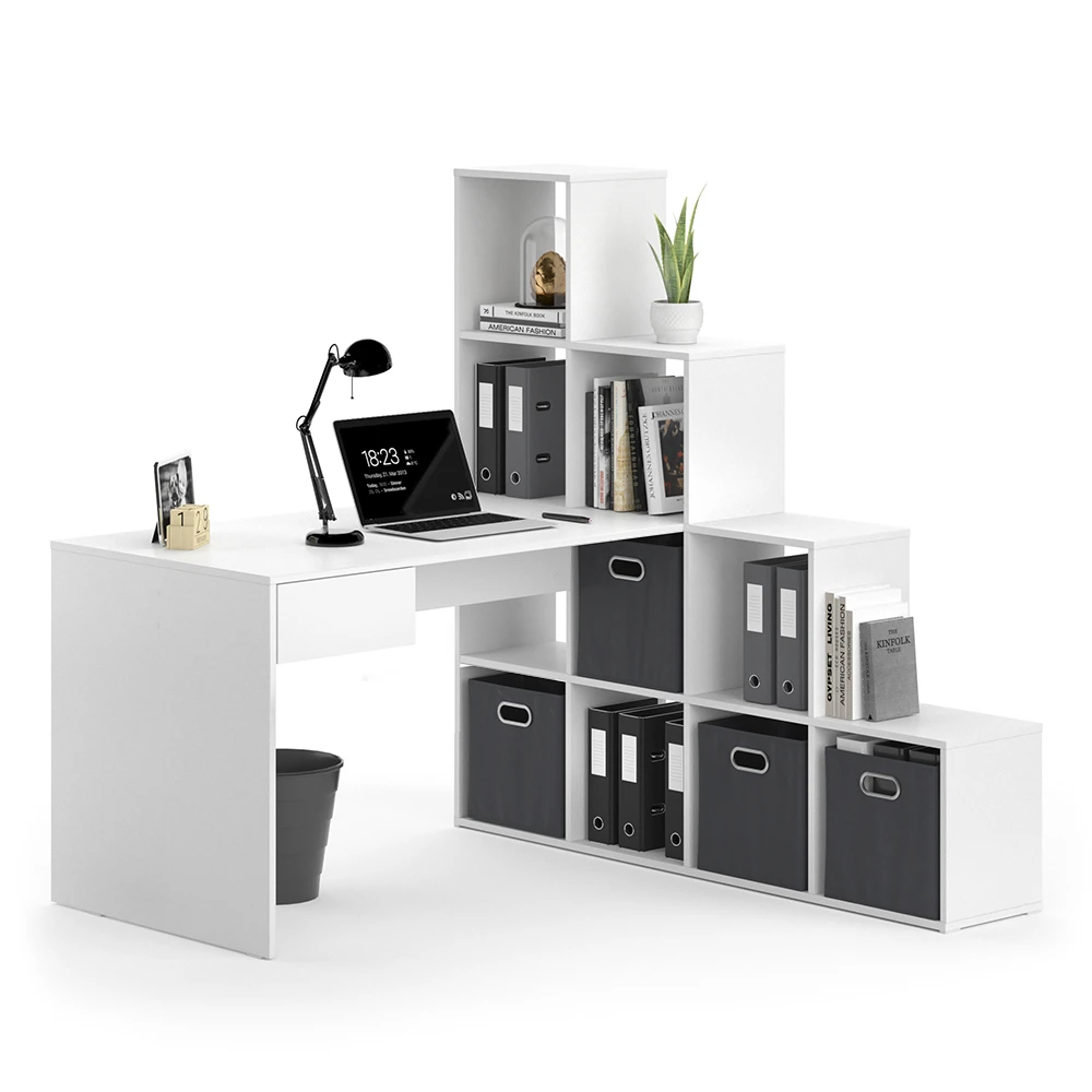 - Dieser Winkelschreibtisch bietet reichlich Stauraum mit einem Seitenregal mit 10 Fächern und einer ausziehbaren Schublade – ideal für zu Hause oder im Büro.