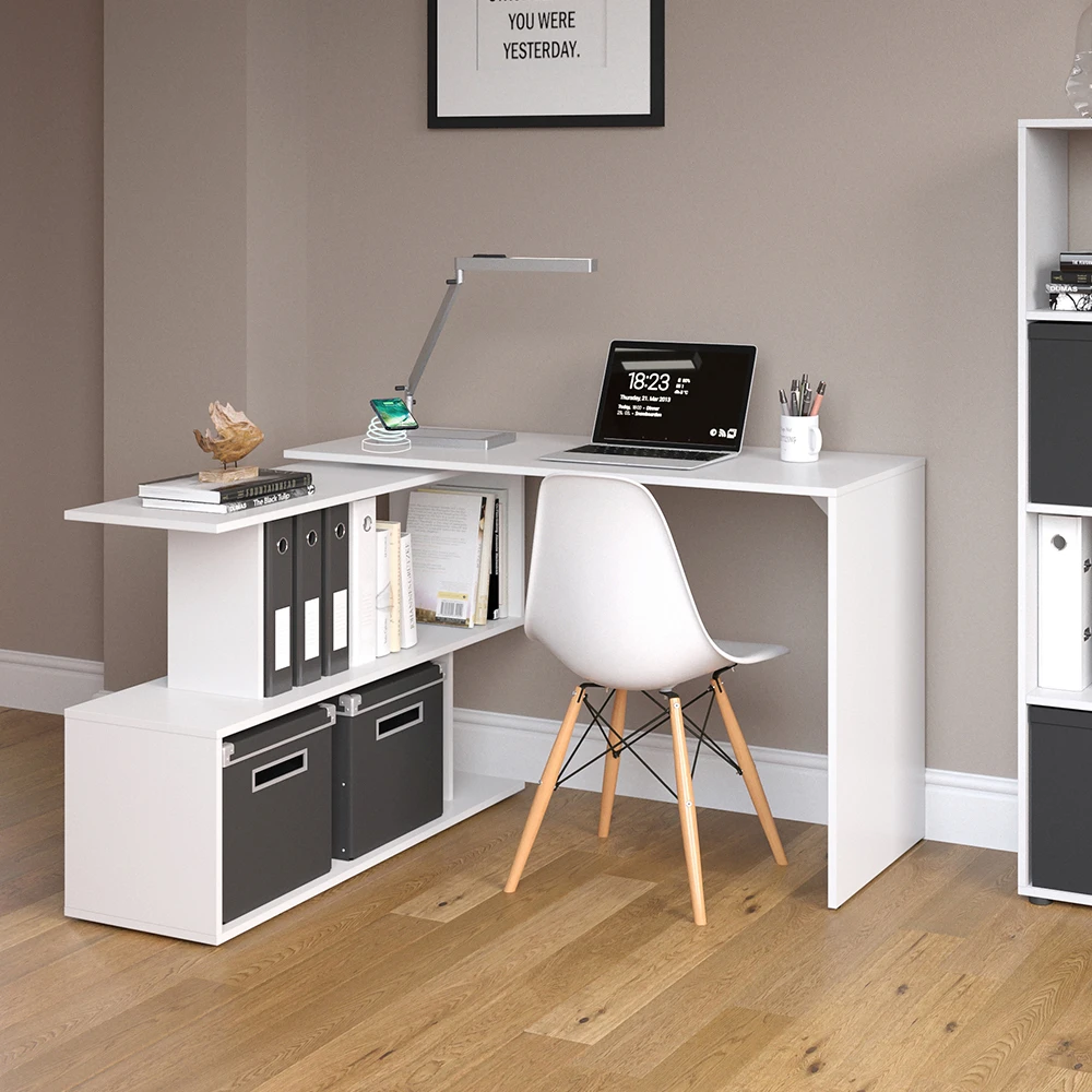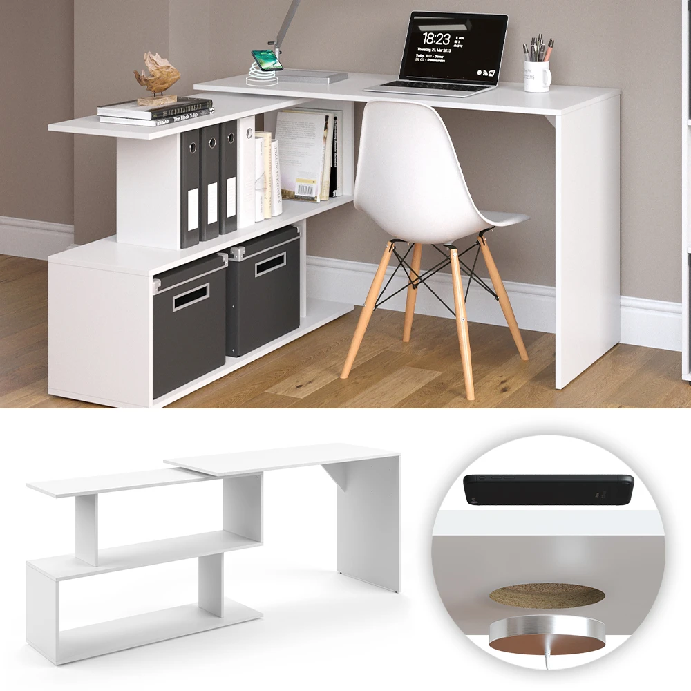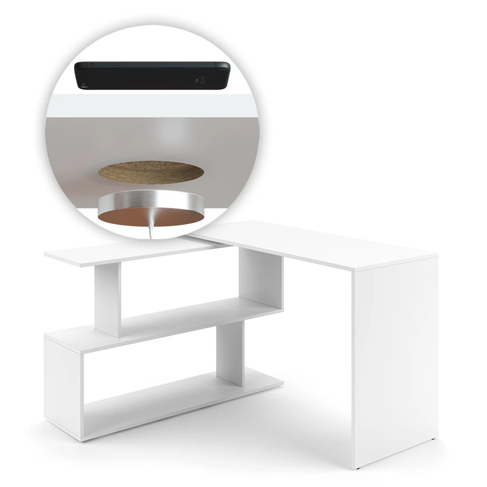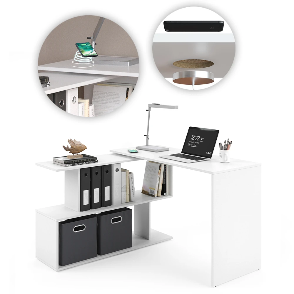 Der modulare Eckschreibtisch ist ein wesentlicher Bestandteil jeder Wohnung oder jedes Hauses. Die großen Nischen sind ideal für Büromaterial und Dokumente. Darin können Sie die benötigten Dokumente und Ordner unterbringen und haben sie dank der offenen Gestaltung immer griffbereit. Einzigartig ist auch das in den Schreibtisch integrierte Qi-Ladegerät. Ohne Sie von Ihrer Arbeit abzulenken, wird Ihr Mobiltelefon neben Ihnen platziert und parallel aufgeladen, ohne dass die Kabel immer im Weg sind oder verloren gehen. Das flexible Design des Levia-Eckschreibtisches lässt sich bequem in Ihr Büro integrieren.