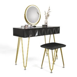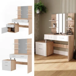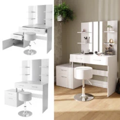Schminktisch „Sherry“ Weiß Hochglanz 120 Cm Mit LED Beleuchtung, Hocker Und Spiegelregal Vicco