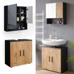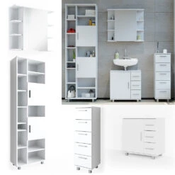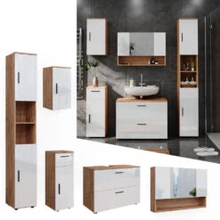 Badmöbel Set „Irma“ Eiche/Weiß Hochglanz 3 Teile, Mit Schubladenschrank Und Midischrank Vicco