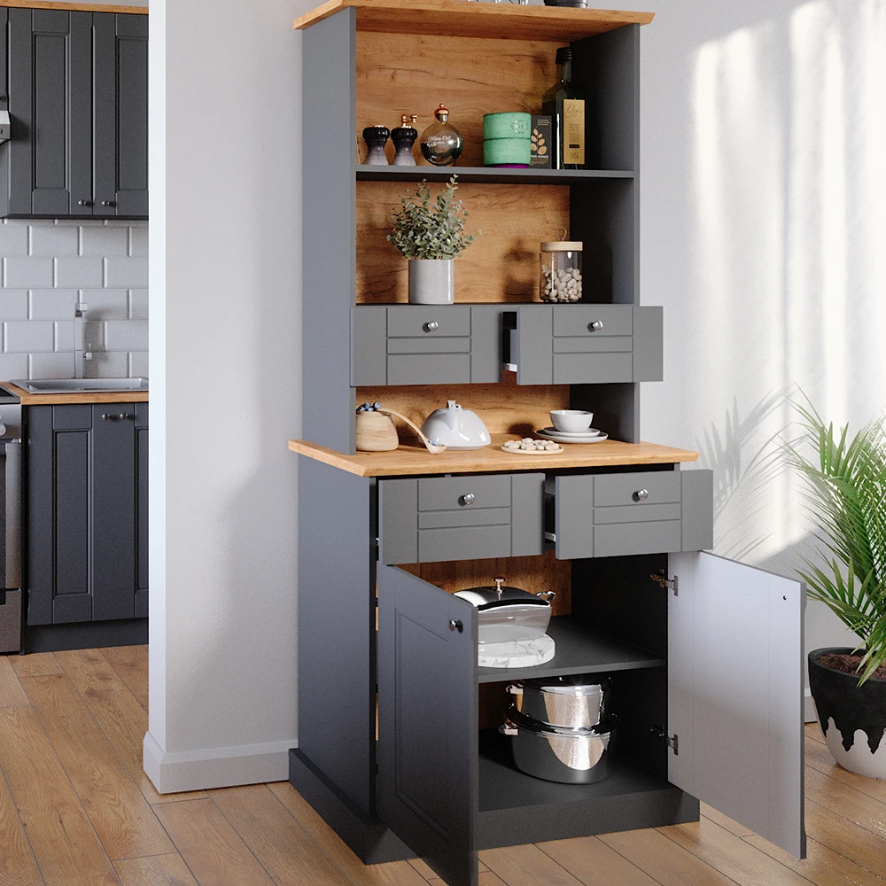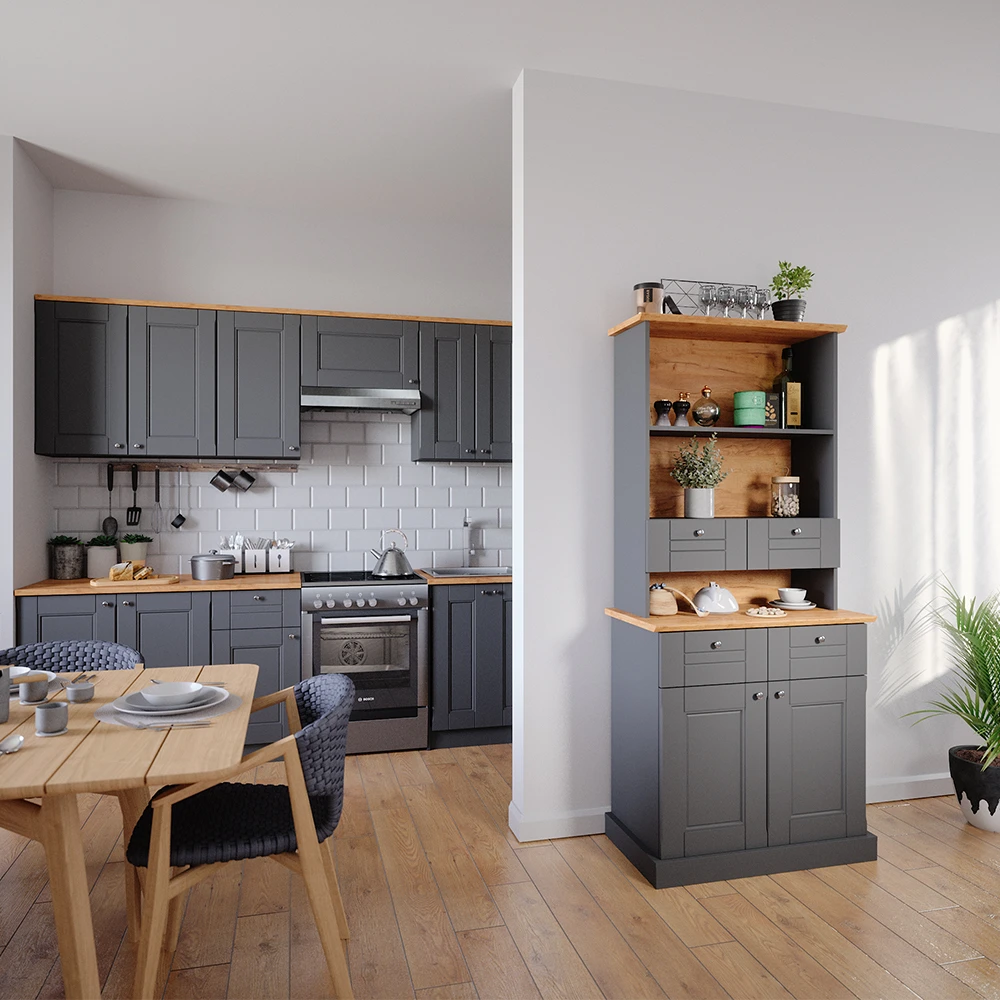 - MAßE: Der Küchenhochschrank hat eine Breite von 80 cm, eine Höhe von 186,2 cm und eine Tiefe von 43 cm. Alle detaillierten Größen sind auf den Fotos angegeben.