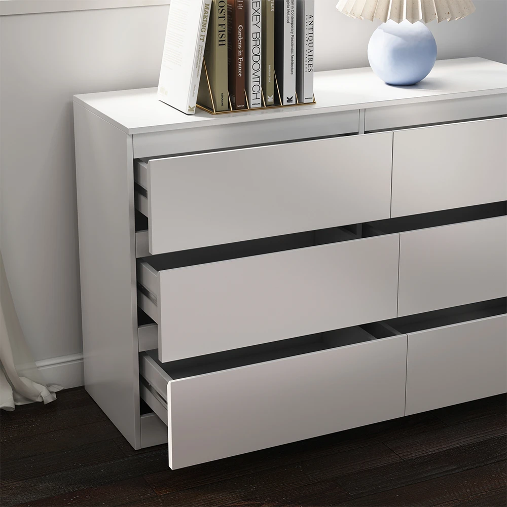 Dieses Möbelstück beeindruckt mit einem zeitgemäßen Design, das jedem Raum einen Hauch von Eleganz verleiht. Gleichzeitig bietet es mit 6 großzügigen Schubladen eine hervorragende Lösung für Ihren Aufbewahrungsbedarf. Die Oberfläche dieses Highboards erfordert nur minimale Pflege, um ihre Schönheit zu bewahren. Mit einer unkomplizierten Montage können Sie diese Anrichte im Handumdrehen platzieren und sofort von ihrem Nutzen profitieren.