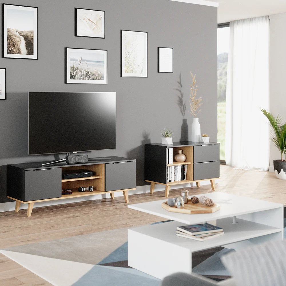 - MATERIAL: Das TV-Board besteht aus pflegeleichter Spanplatte 16 mm, mit einer Melaminharzbeschichtung.