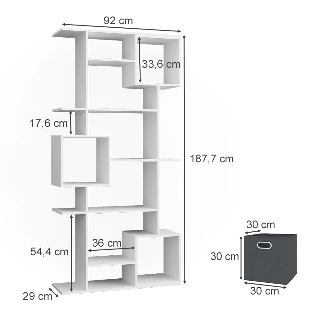 Unser Raumteiler ist nicht nur ein praktisches Möbelstück, sondern auch ein echter Blickfang in jedem Raum. Mit seinem offenen Design und den neun Einlegeböden bietet er nicht nur viel Stauraum, sondern auch die Möglichkeit, ihn als Bücherregal oder Würfelregal zu nutzen. Die fachböden für 30×30 Kartons machen ihn zum perfekten Aufbewahrungsort für Spielzeug, Büroartikel oder DIY-Materialien. Durch sein funktionelles Design lässt sich unser Raumteiler hervorragend mit anderen Möbelstücken kombinieren und passt sich so flexibel den individuellen Wünschen und Bedürfnissen an. Ob im Wohnzimmer, im Büro oder im Kinderzimmer – unser Raumteiler setzt überall Akzente. Lassen auch Sie sich von seinem Charme begeistern!