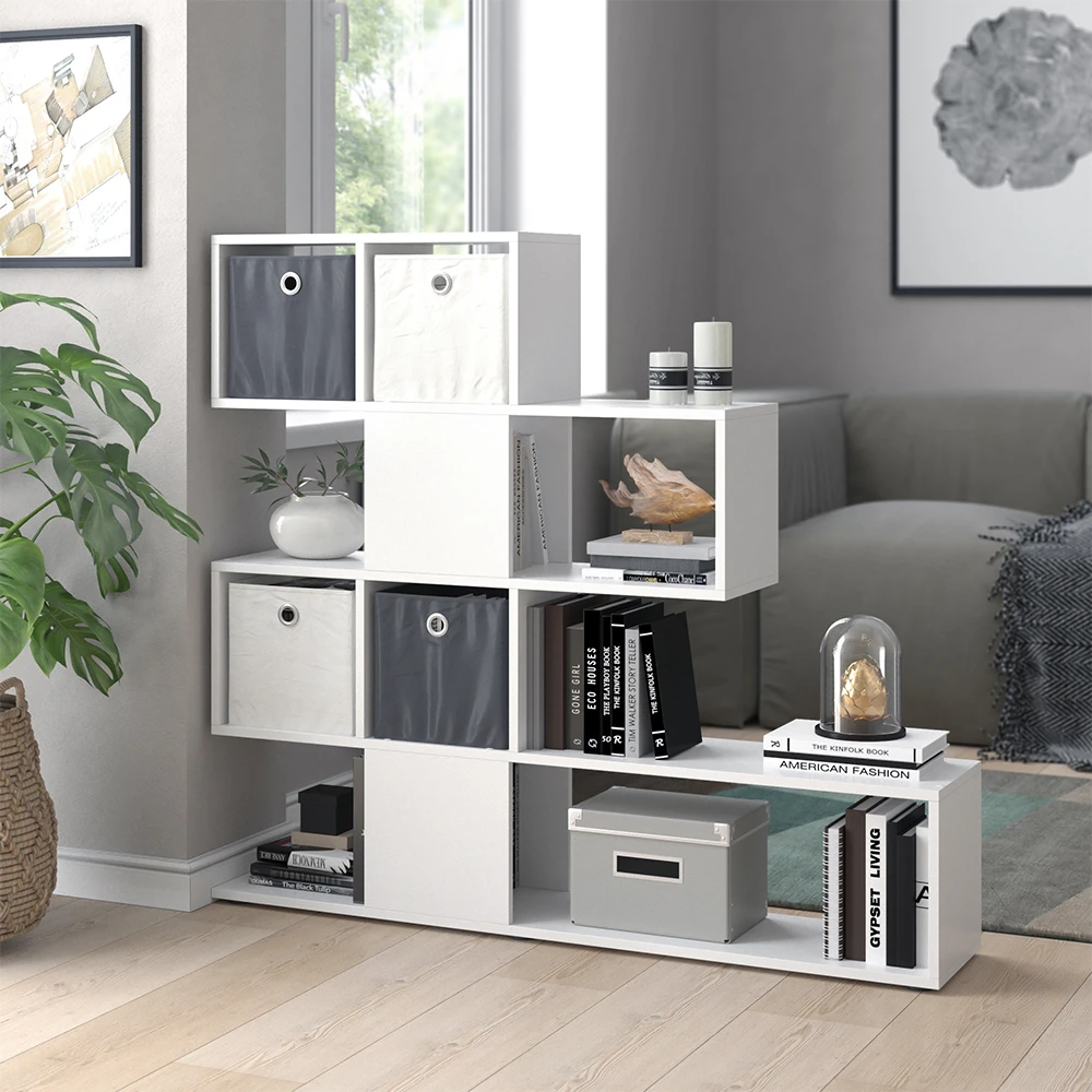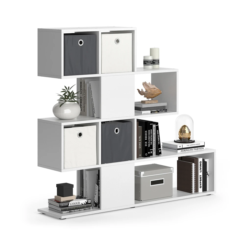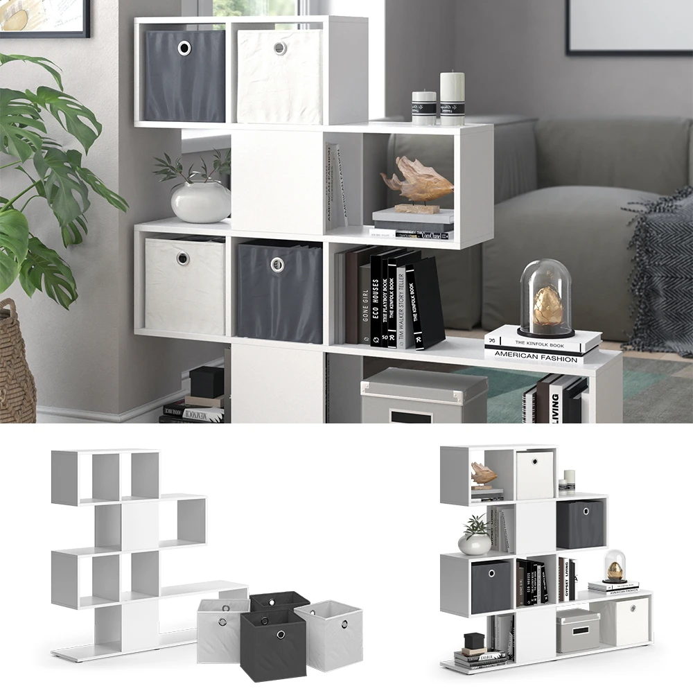 - Der Vicco Raumteiler Hylda ist ein stilvolles Standregal in Weiß mit 4 Faltboxen. Das Treppenregal stehend eignet sich perfekt als offener Raumteiler oder Bücherschrank im Wohnzimmer.
