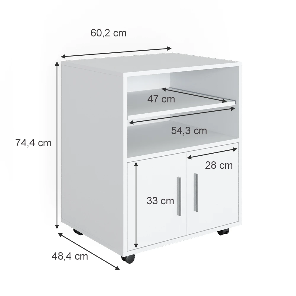 - MAßE: Der Bürotisch rollbar hat eine Breite von 60 cm, eine Höhe von 74 cm und eine Tiefe von 48 cm. Alle detaillierten Größen sind auf den Fotos angegeben.