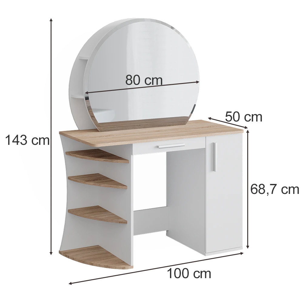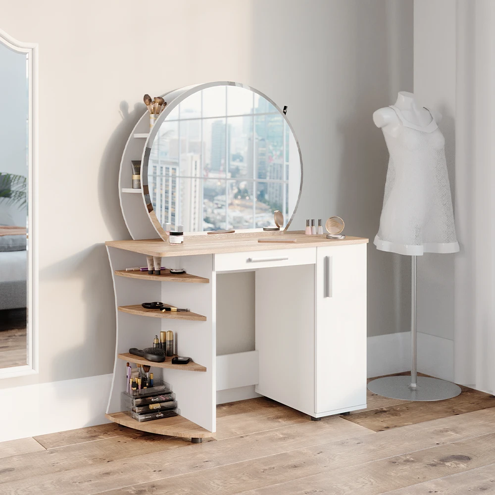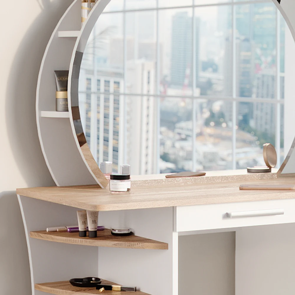 Almina – Der Schminktisch, der Ihre Beauty-Routine zum Leben erweckt! Dieser Frisiertisch mit Spiegel ist eine stilvolle und praktische Ergänzung für jeden Raum, in dem Sie sich für einen besonderen Anlass oder einfach für Ihren täglichen Look zurechtmachen möchten. Mit seiner kreativen Gestaltung und den offenen Regalen sowie mehreren geschlossenen Schubladen bietet der Schminktisch ausreichend Stauraum, um alle Ihre Kosmetikartikel ordentlich aufzubewahren. Der große runde Spiegel ist perfekt für das Auftragen von Make-up und Frisieren geeignet. Wählen Sie aus verschiedenen Ausführungen, die Ihrem Stil und Geschmack entsprechen. Lassen Sie Almina Ihre Morgenroutine aufpeppen und fühlen Sie sich wie eine richtige Fashionista!