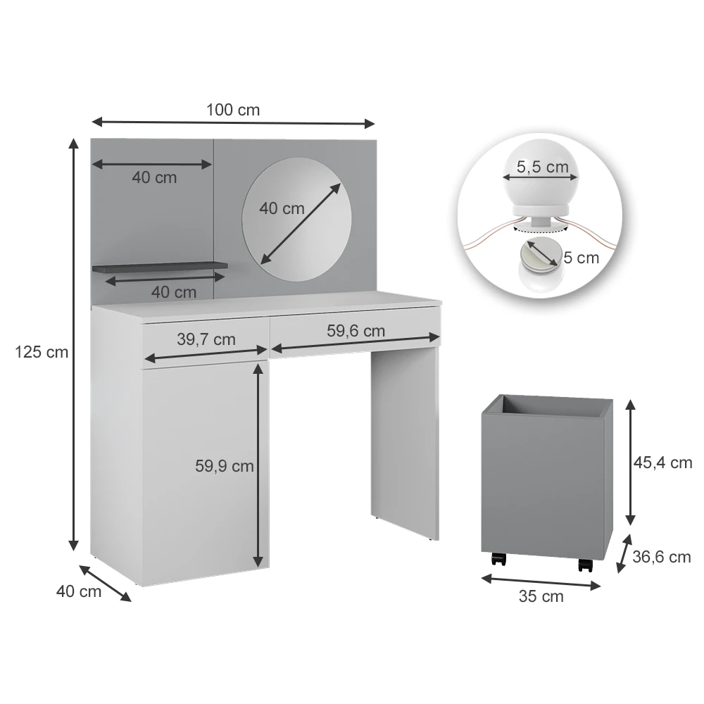 - MAßE: Der Frisiertisch hat folgende Abmessungen: Breite: 100 cm, Höhe: 125 cm, Tiefe: 40 cm. Alle detaillierten Größen sind auf den Fotos angegeben.
