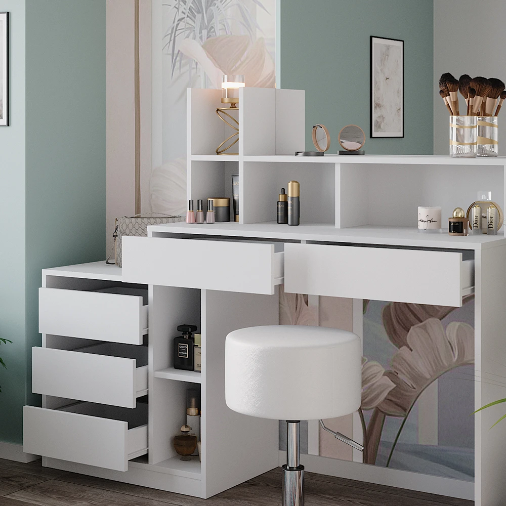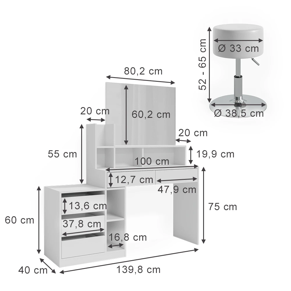 Dieser Schminktisch überzeugt mit einem großzügigen Spiegel, der Ihnen ein umfassendes Bild Ihres Looks ermöglicht und Ihre Beauty-Routine optimiert. Das moderne Design ist in einer stilvollen 2-Farben-Kombination, die Ihre Einrichtung ergänzen, erhältlich. Dank der pflegeleichten Oberfläche bleibt Ihr Schminktisch stets makellos und ist leicht sauber zu halten. Die einfache Montage ermöglicht Ihnen eine schnelle und unkomplizierte Nutzung Ihres neuen Schminktisches.