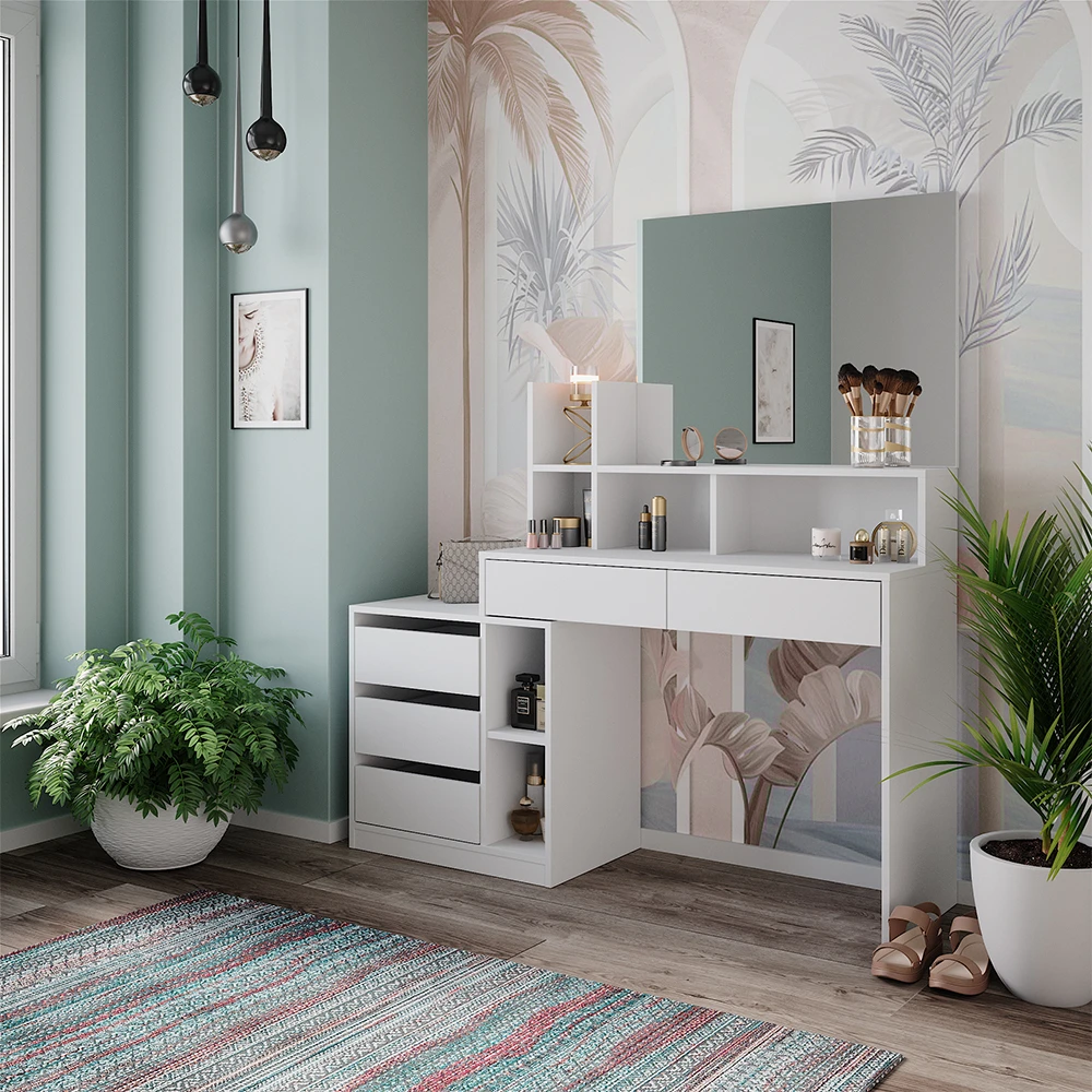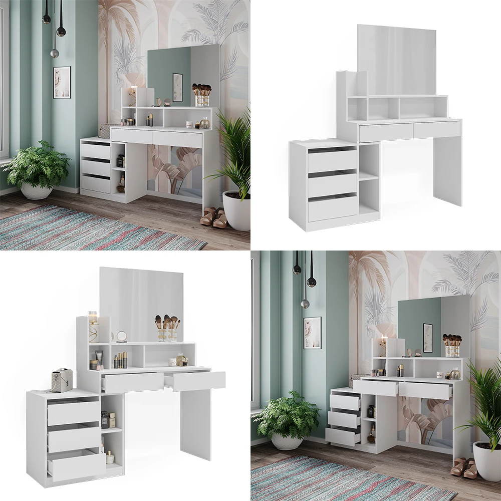 Dieser Schminktisch begeistert mit einem großzügigen Spiegel, der Ihre Schönheitsroutine perfekt ergänzt. Sein modernes Design ist in einer ansprechenden 2-Farben-Kombination erhältlich, um Ihren Stil zu unterstreichen. Die pflegeleichte Oberfläche ermöglicht mühelose Reinigung und langanhaltende Schönheit. Die unkomplizierte Montage sorgt für schnelle Freude an Ihrem neuen Schminktisch.