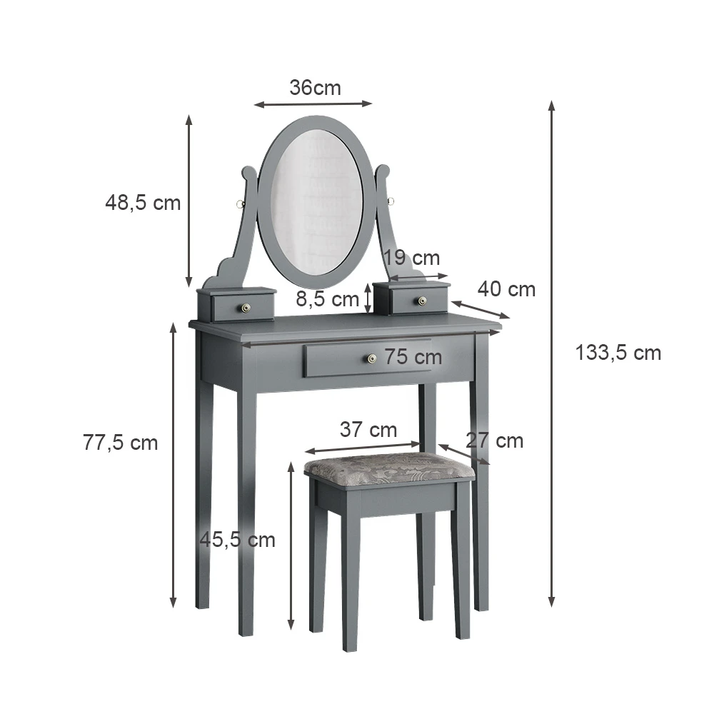 - MAßE: Der Frisiertisch hat eine Breite von 75 cm, eine Höhe von 134 cm und eine Tiefe von 40 cm. Alle detaillierten Größen sind auf den Fotos angegeben.