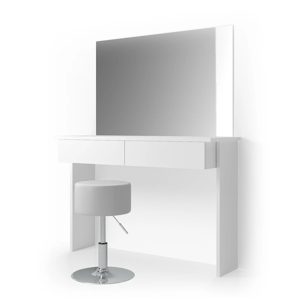- Der Kosmetiktisch mit Spiegel Azur, Weiß ist mit zwei ausziehbaren Schubladen und einem großen rechteckigen Spiegel ausgestattet.