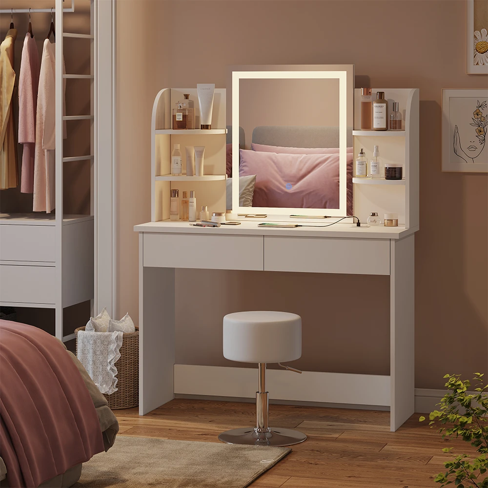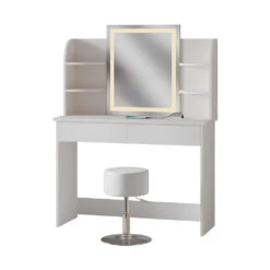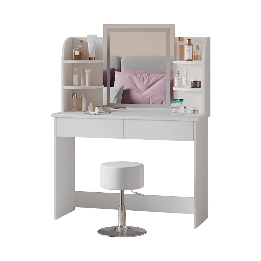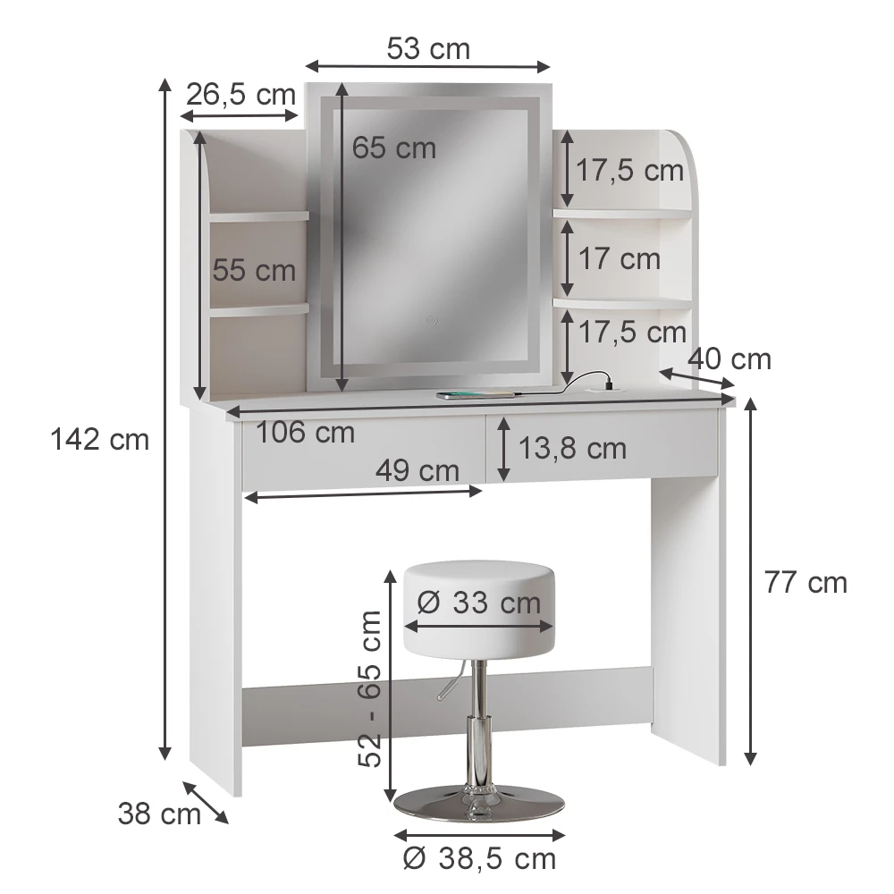Der LED-Spiegel, der in dem Schminktisch integriert ist, fügt jedem Raum sowohl Funktionalität als auch Stil hinzu. Die Beleuchtung durch das LED-Licht bietet verbesserte Sichtbarkeit und erleichtert das Auftragen von Make-Up, das Stylen der Haare oder das Abschließen von Pflegeaufgaben mit Präzision.