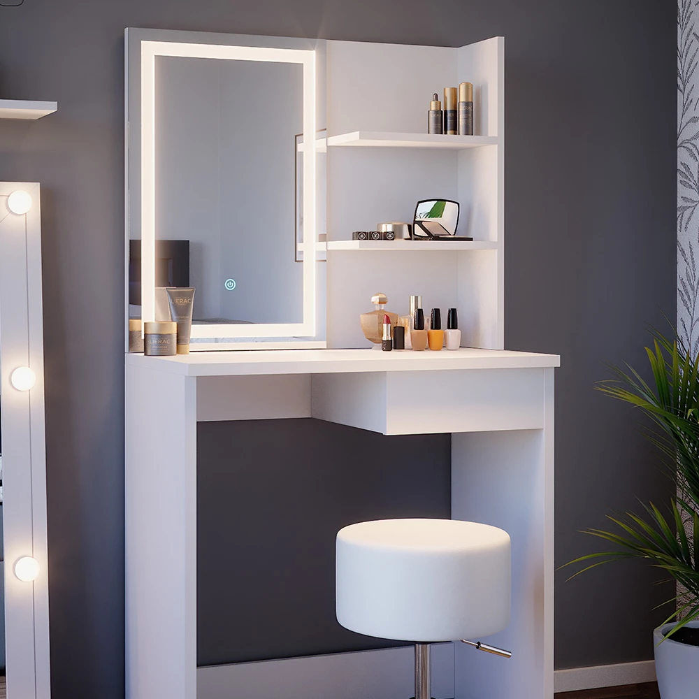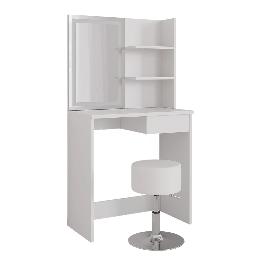 Dieser Schminktisch ist nicht nur ein Ort, um sich zu schminken, sondern auch ein dekoratives Element, das jedem Raum das gewisse Etwas gibt. Der skandinavische Stil zeichnet sich durch schlichtes Design und klare Linien aus und dieser Schminktisch ist ein wunderbares Beispiel dafür. Mit dem eleganten rechteckigen Spiegel und der eingebauten Beleuchtung ist das Schminken jetzt noch einfacher und angenehmer. Die geräumige Schublade und die zwei offenen Fächer bieten ausreichend Platz für Ihre Kosmetikprodukte und Accessoires. Der mitgelieferte Hocker rundet das Gesamtbild perfekt ab und ist eine willkommene Ergänzung für das Gesamterlebnis. Holen Sie sich diesen Schminktisch und Sie werden sich fühlen wie eine Prinzessin in Ihrem eigenen Zimmer!