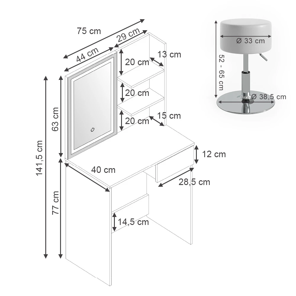 - LIEFERUMFANG: Schminktisch, LED-Spiegel, Hocker, Montageanleitung, Montagematerial