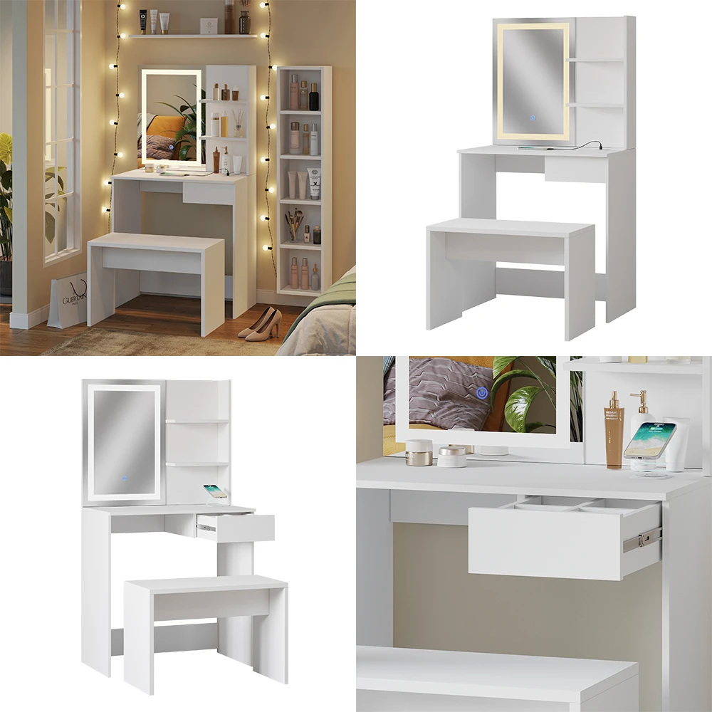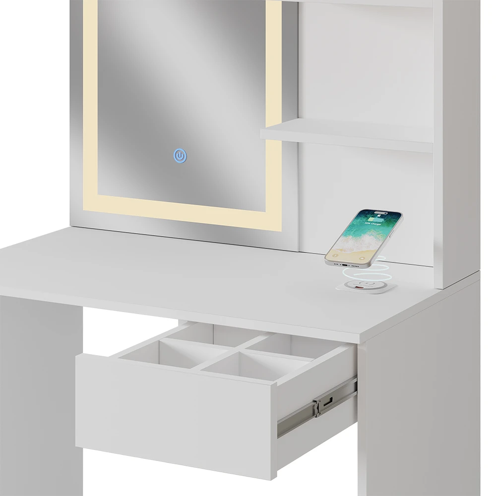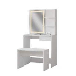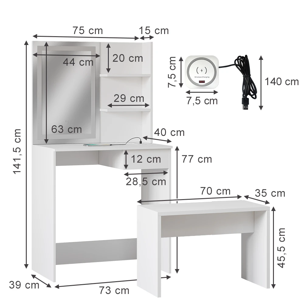 Der LED-Spiegel, der in dem Schminktisch integriert ist, fügt jedem Raum sowohl Funktionalität als auch Stil hinzu. Die Beleuchtung durch das LED-Licht bietet verbesserte Sichtbarkeit und erleichtert das Auftragen von Make-Up, das Stylen der Haare oder das Abschließen von Pflegeaufgaben mit Präzision.