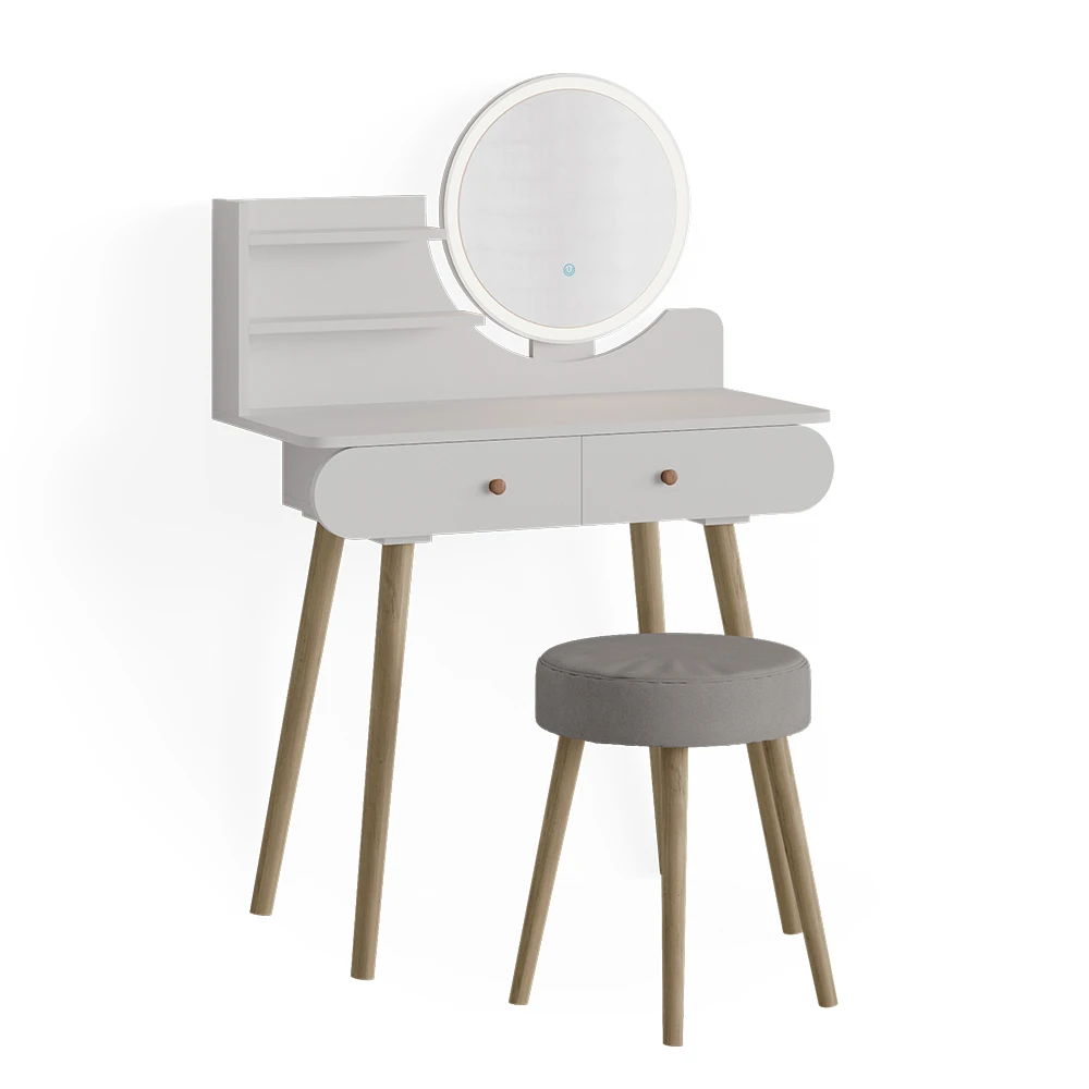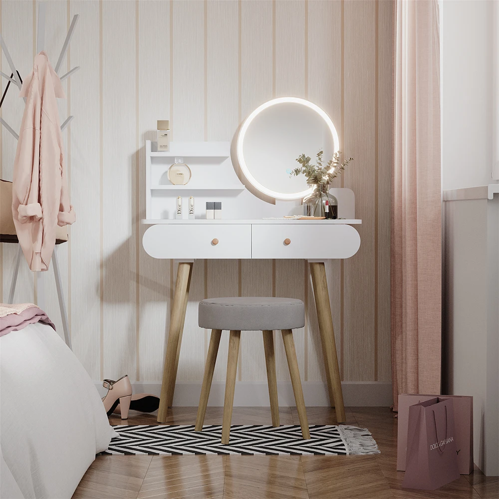 - Der Kosmetiktisch mit Spiegel in Weiß bietet zwei geschlossene Ablagen und Holzbeine. Mit seinem eleganten runden Spiegel ist er perfekt für eine stilvolle Schminkroutine.