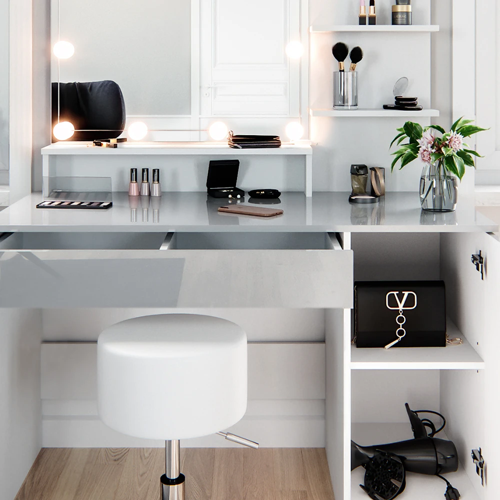 Die Möbelserie „Elisa“ bietet Schminktische in verschiedenen Farbkombinationen und vielen verschiedenen Optionen und Konfigurationen. Schaffen Sie mit einem Schminktisch aus der Serie „Elisa“ einen stilvollen und funktionalen Bereich in Ihrem Zuhause.
