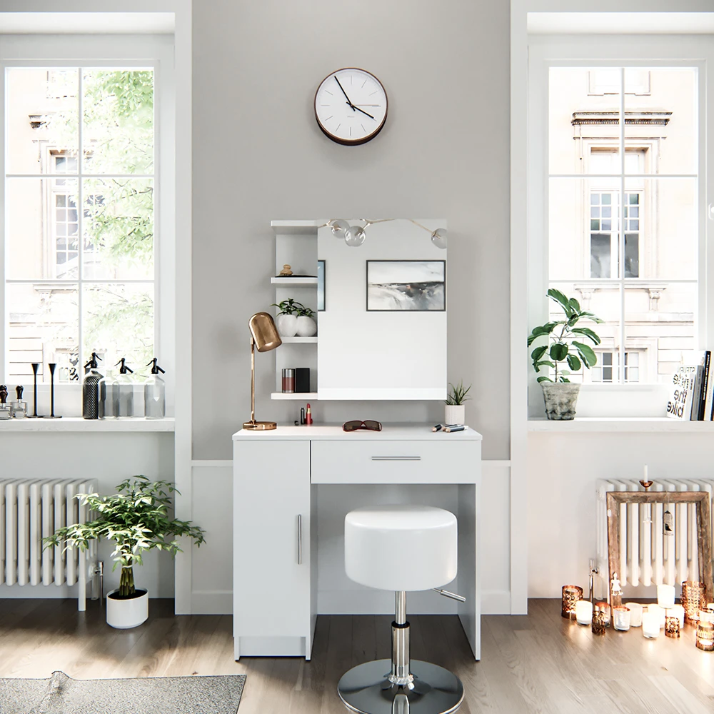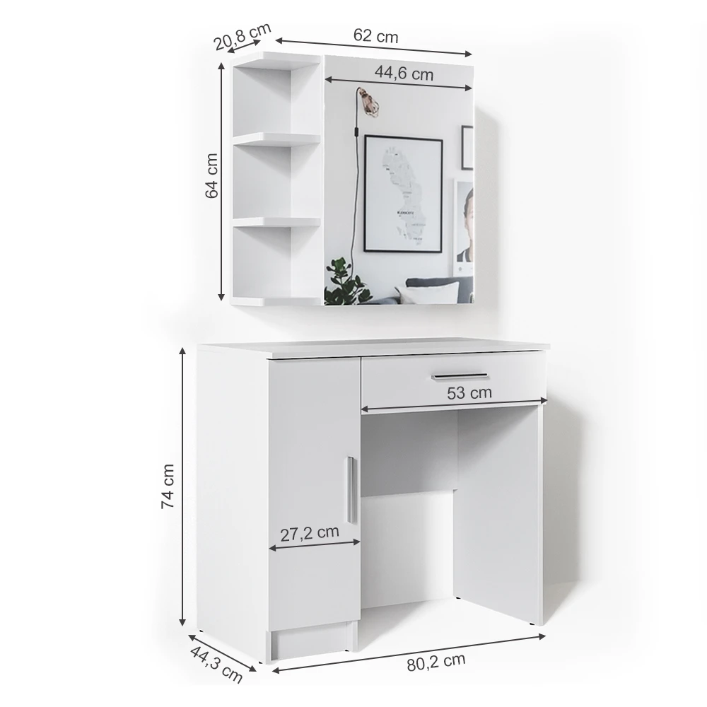 - MATERIAL: Die Schminkkommode besteht aus pflegeleichter Spanplatte 16 mm, mit einer Melaminharzbeschichtung.