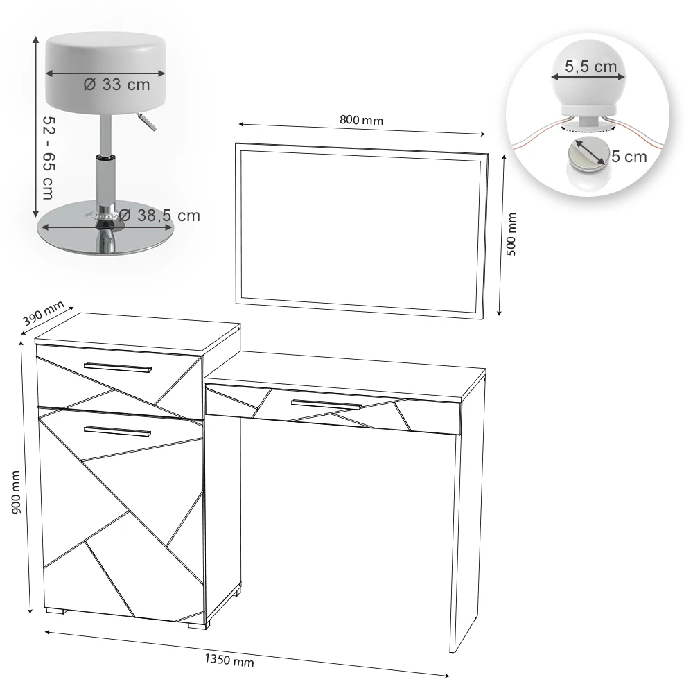- MAßE: Der Frisiertisch hat eine Breite von 135 cm, eine Höhe von 90 cm und eine Tiefe von 39 cm. Alle detaillierten Größen sind auf den Fotos angegeben.