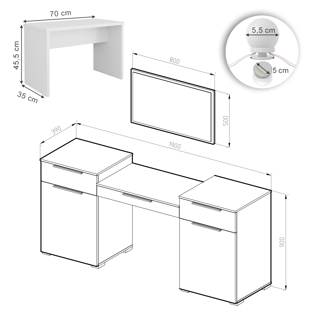 - MAßE: Der Frisiertisch hat eine Breite von 190 cm, eine Höhe von 90 cm und eine Tiefe von 39 cm. Alle detaillierten Größen sind auf den Fotos angegeben.
