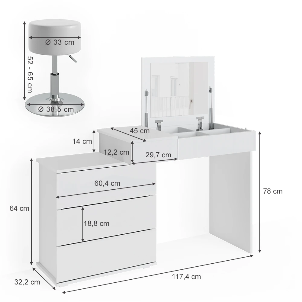 - MATERIAL: Die Schminkkommode besteht aus pflegeleichter Spanplatte 16 mm, mit einer Melaminharzbeschichtung.