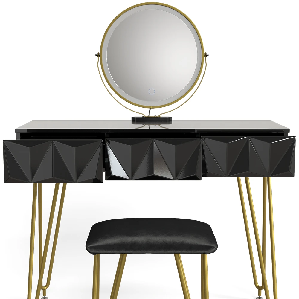 - Der Kosmetiktisch mit Spiegel bietet drei geschlossene Schubladen und elegante Metallbeine. Der runde Spiegel rundet das elegante Design ab.