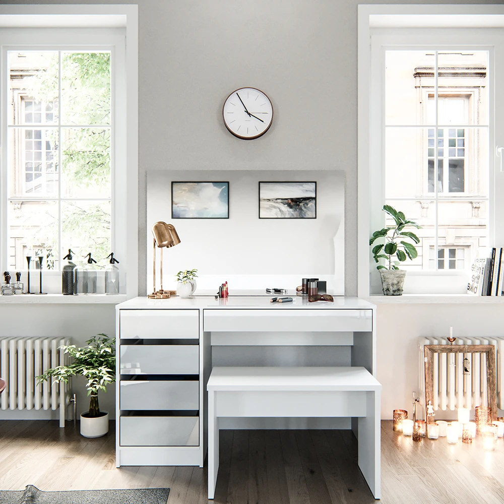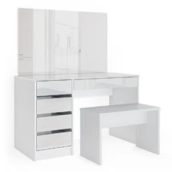 Der Schminktisch Sherry mit Bank ist das perfekte Upgrade für Ihr Schlafzimmer oder Badezimmer. Mit seinen fünf geschlossenen Fachböden bietet dieser Frisiertisch genügend Stauraum für all Ihre Kosmetikartikel. Das funktionelle Design und die robuste Konstruktion machen ihn zu einem langlebigen Begleiter für Ihre tägliche Schönheitsroutine. Der große rechteckige Spiegel ermöglicht es Ihnen, jedes Detail Ihres Make-ups perfekt zu sehen. Und das Beste ist, dass dieses Schminktischmodell in verschiedenen Ausführungen erhältlich ist, um Ihren einzigartigen Stil zu ergänzen. Ein Schminktisch wie Sherry verleiht Ihrem Zimmer eine charmante Note und lädt Sie ein, sich wie eine wahre Königin zu fühlen. Träumen Sie nicht länger von einem perfekten Schminktisch – machen Sie Sherry zu Ihrem treuen Begleiter!
