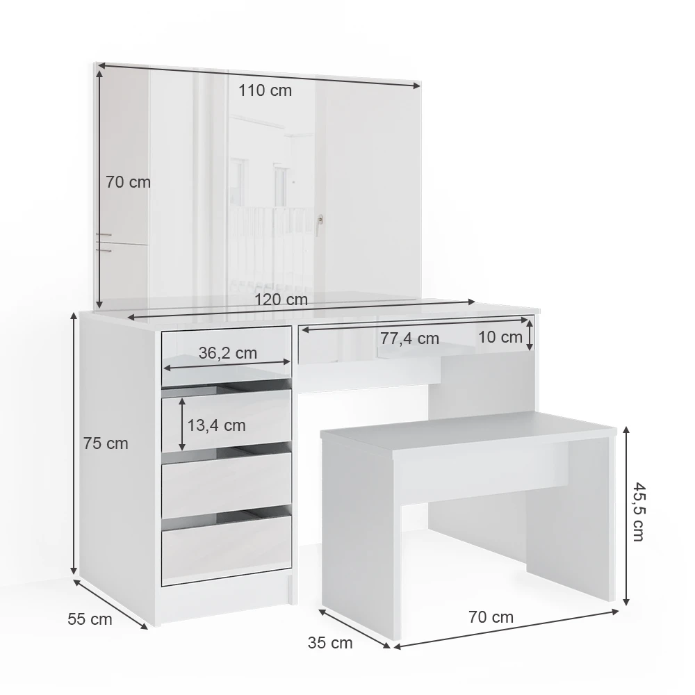 - MATERIAL: Die Schminkkommode besteht aus pflegeleichter Spanplatte 16 mm, mit einer Melaminharzbeschichtung.